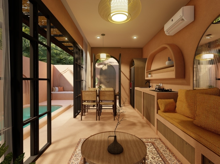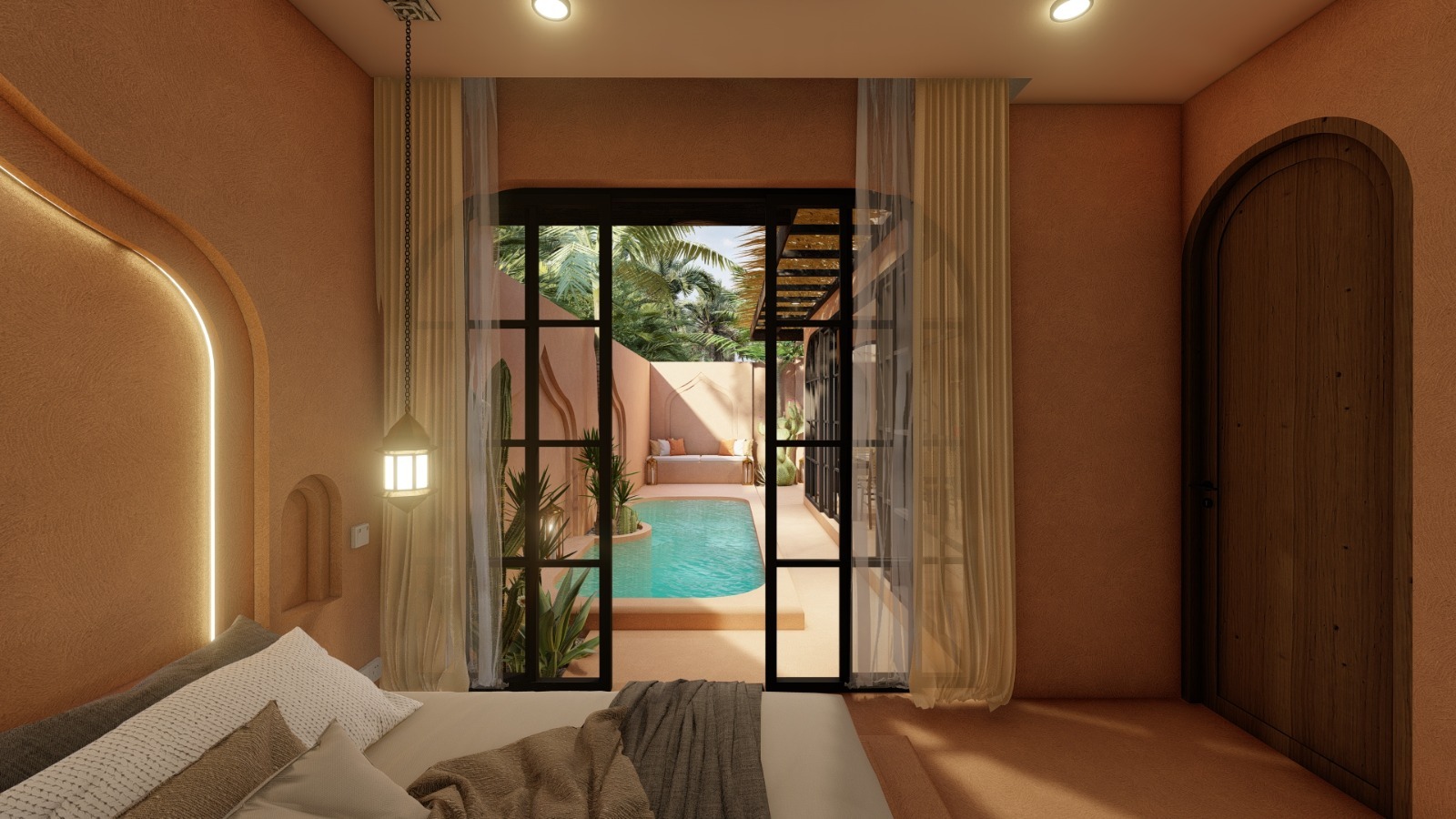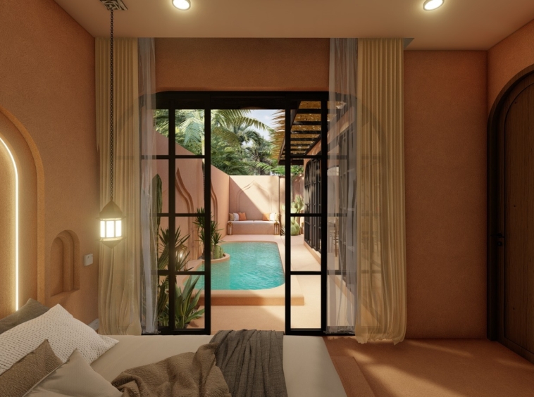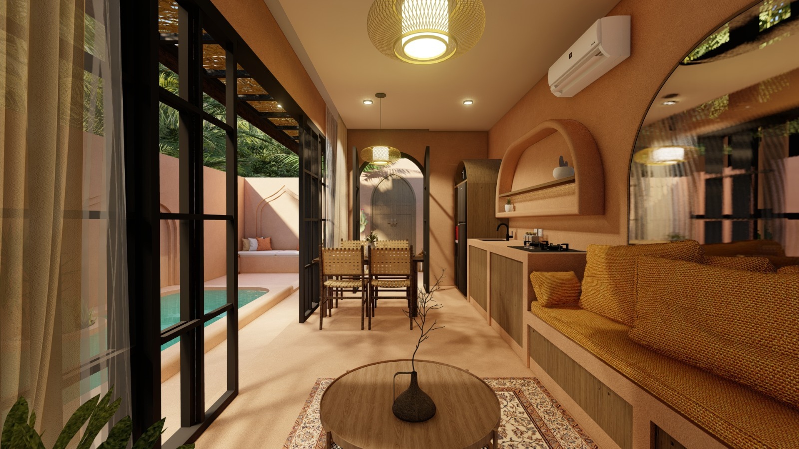 This is a stylish, fully furnished living space with contemporary design and top-notch amenities, ideally situated for both rent and residence. It features a spacious master bedroom complete with a large dressing area and offers pool views and direct access. The living room and bedroom provide pristine vistas of the lush swimming pool, with convenient bathroom access. High ceilings bathe the space in natural light and a cozy ambiance. All villas are thoughtfully equipped with everything you need for comfortable living or renting, including a well-equipped kitchen, a relaxing sofa area, a functional desk, and an inviting outdoor chill-out space by the pool.