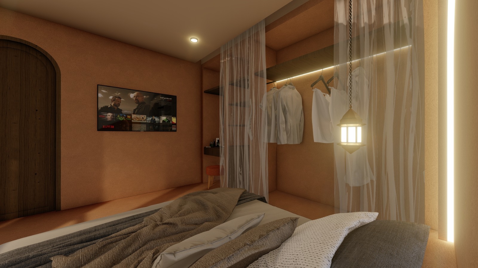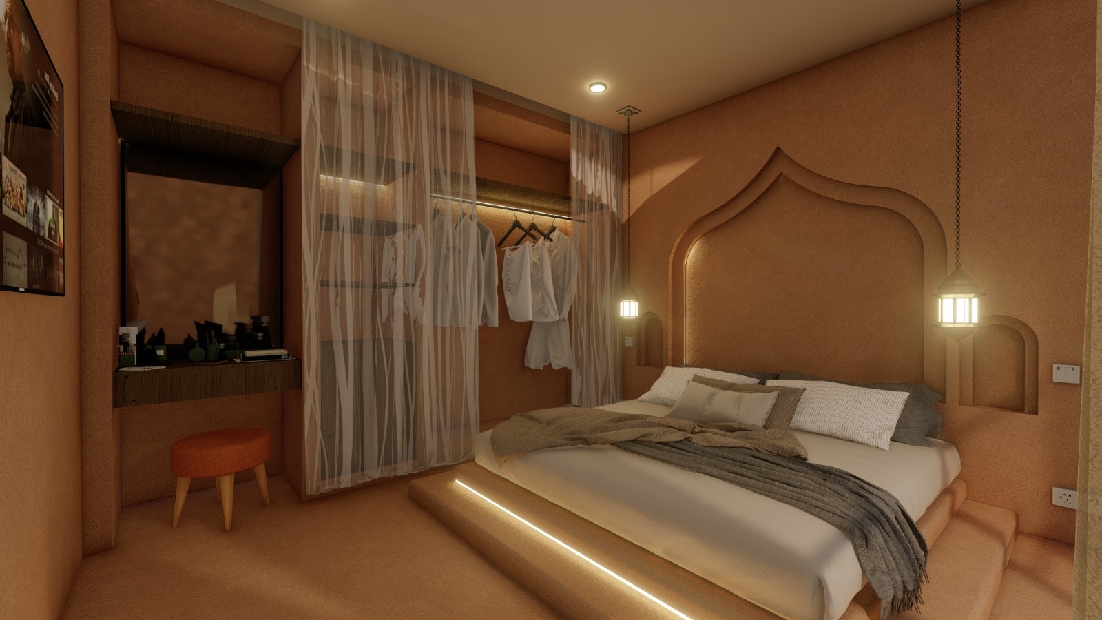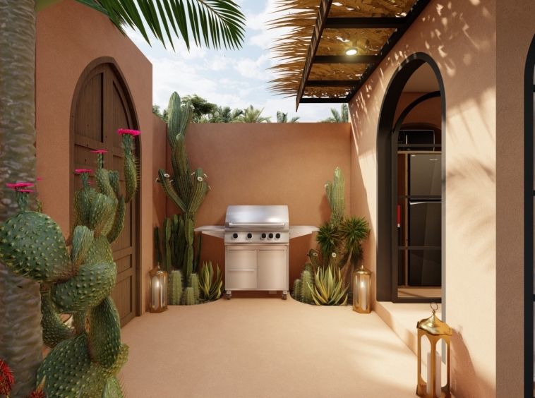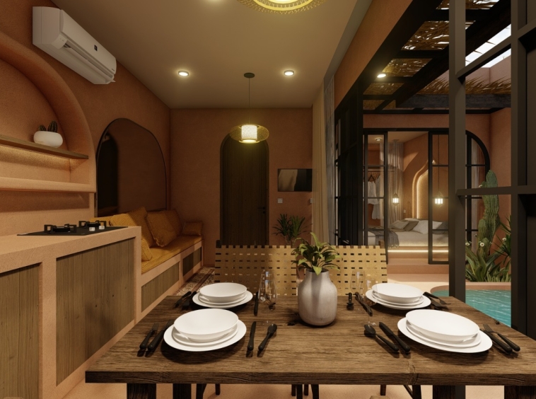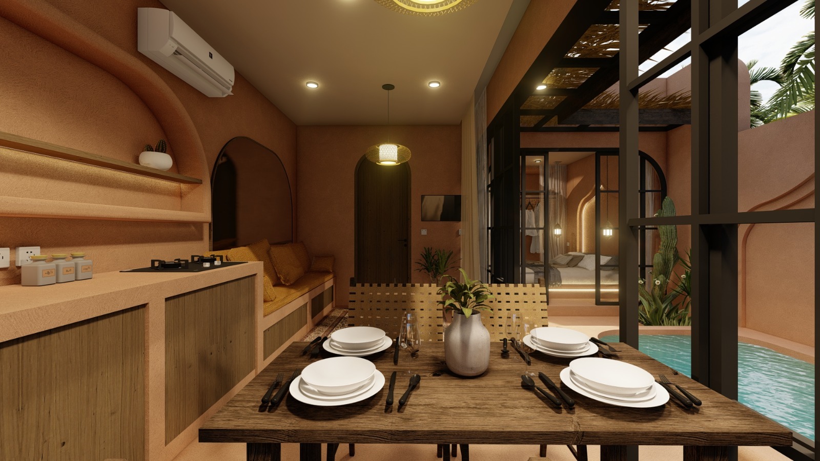 This is a stylish, fully furnished living space with contemporary design and top-notch amenities, ideally situated for both rent and residence. It features a spacious master bedroom complete with a large dressing area and offers pool views and direct access. The living room and bedroom provide pristine vistas of the lush swimming pool, with convenient bathroom access. High ceilings bathe the space in natural light and a cozy ambiance. All villas are thoughtfully equipped with everything you need for comfortable living or renting, including a well-equipped kitchen, a relaxing sofa area, a functional desk, and an inviting outdoor chill-out space by the pool.
