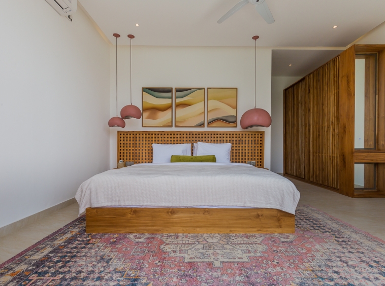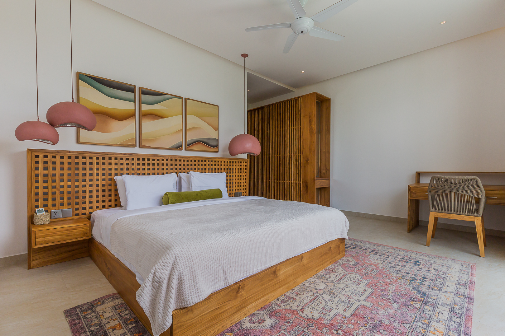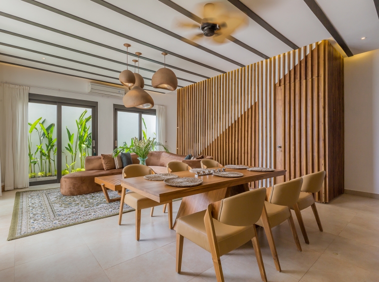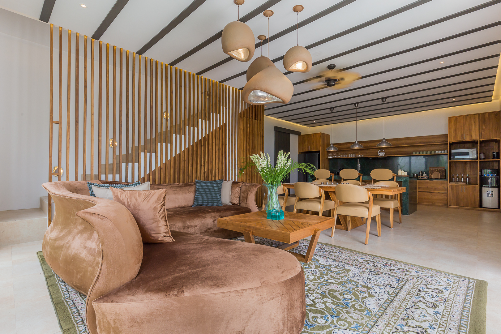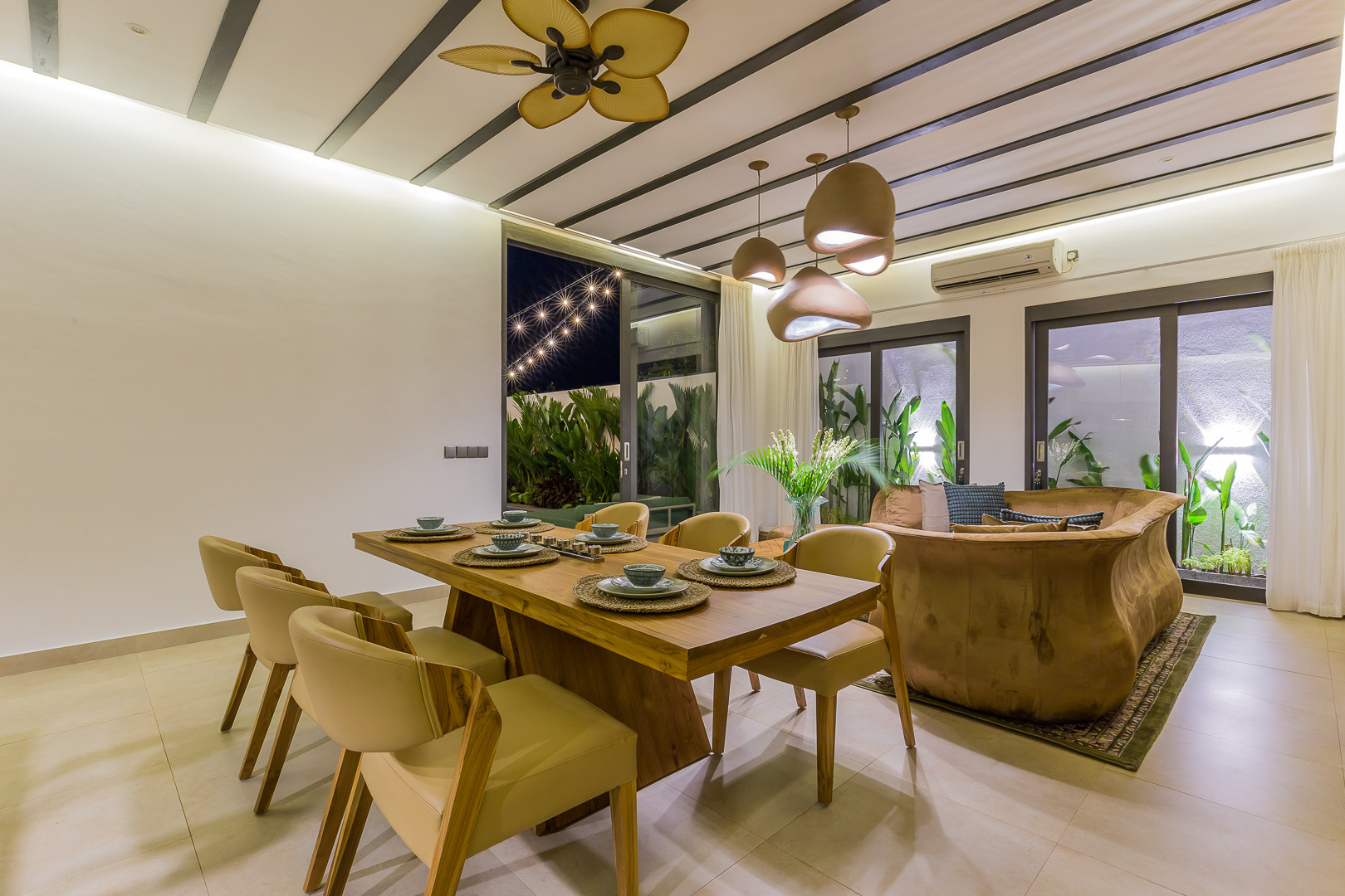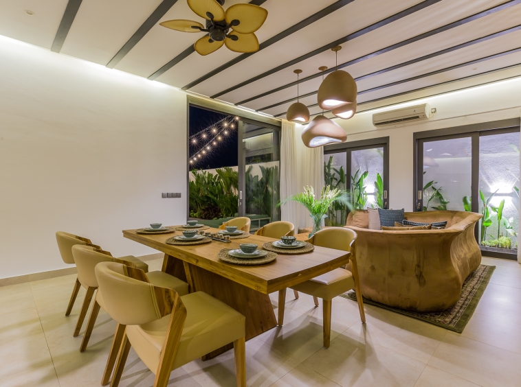 The villa is built above 260 sqm of land with 285 sqm of total living area. The architecture boasts a 2-story design and is thoughtfully finished. The first floor features 2 luxurious bedrooms – each with a full bathroom, and a large living area that is finely integrated with a well-equipped kitchen and a very spacious dining space. The outdoor section features a beautiful swimming pool, a sundeck area, a verdant garden, and an expansive open space that is connected to the house entrance.