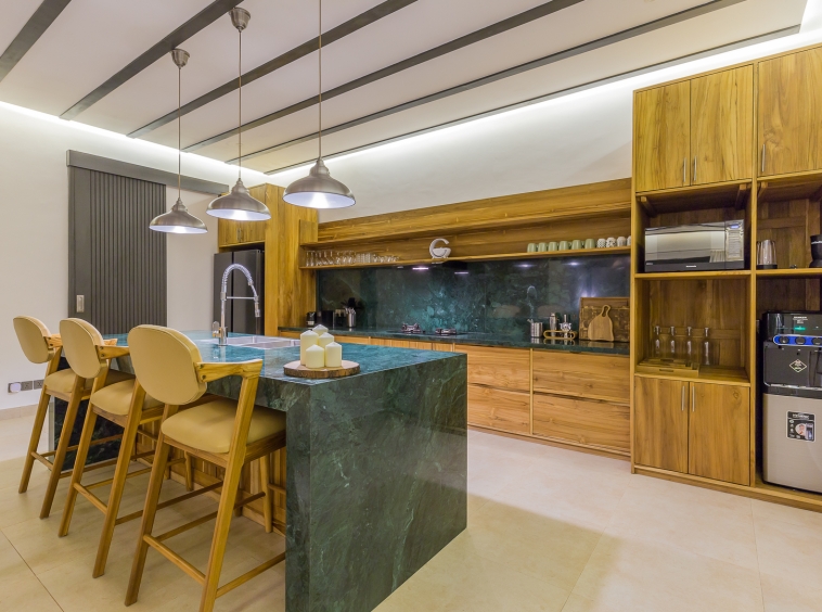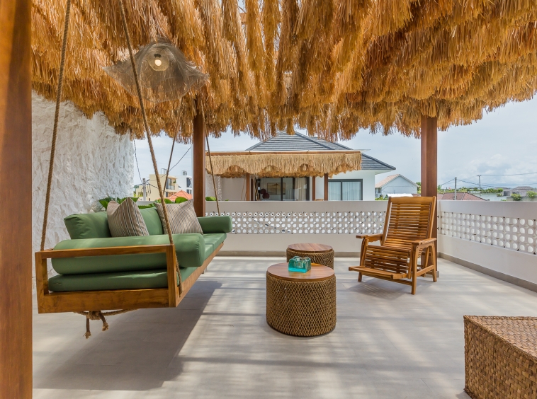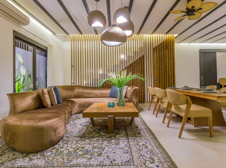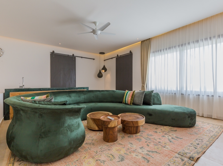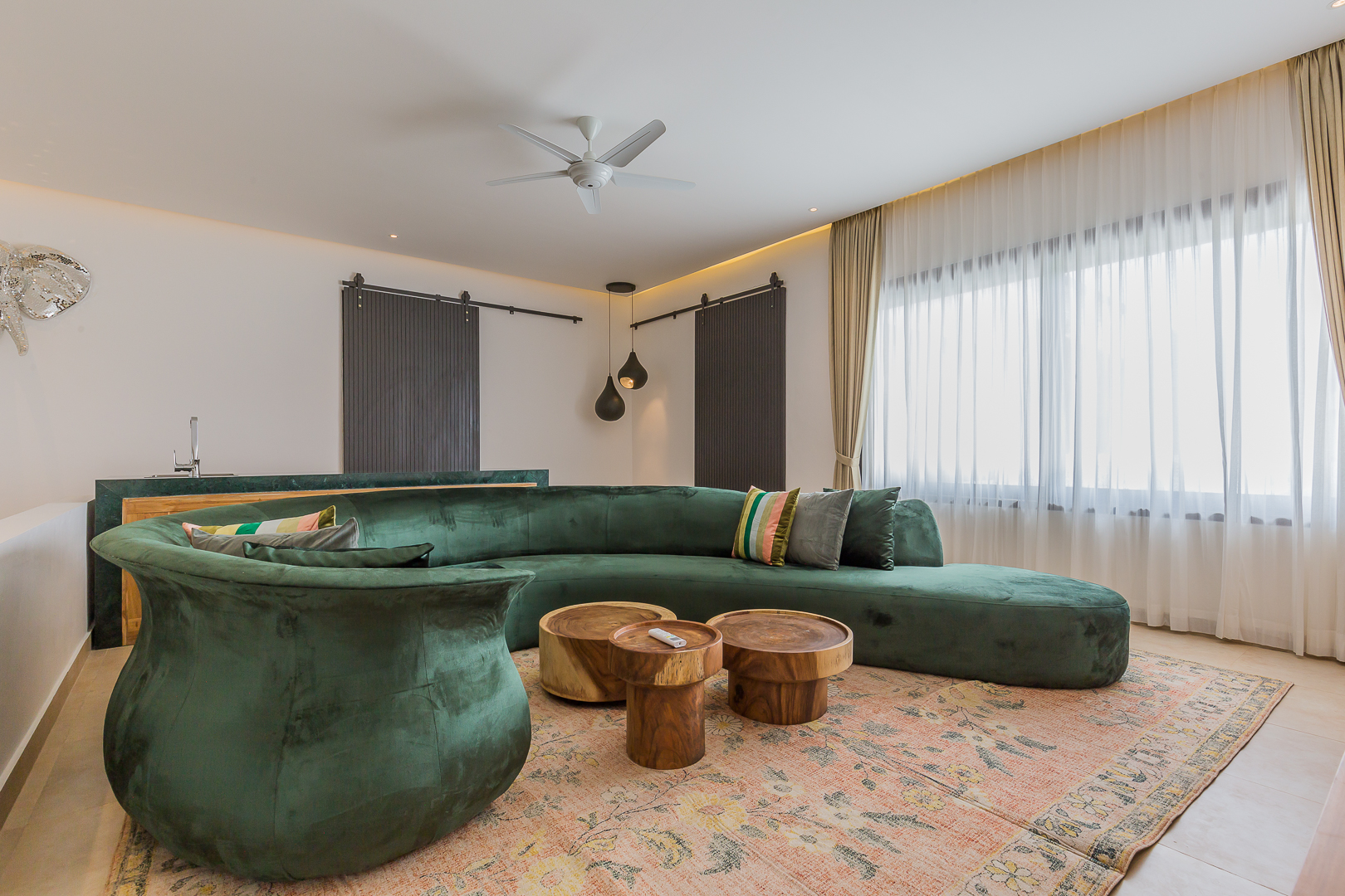 The top floor features 1 master bedroom with a master bathroom, an expansive gathering space with a large semi-circular seating set, a bar island, and another TV set, as well as a capacious rooftop section to view the green surroundings while enjoying the soft breezes that is typical of the village. This villa is fully furnished and is provided with complete amenities. In addition, it also provides private parking space that is suitable for a car and a few bikes.