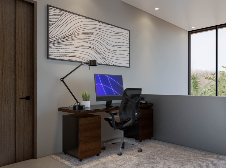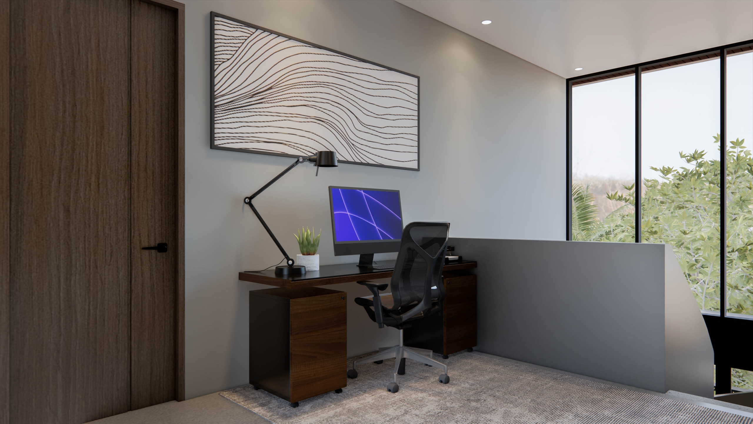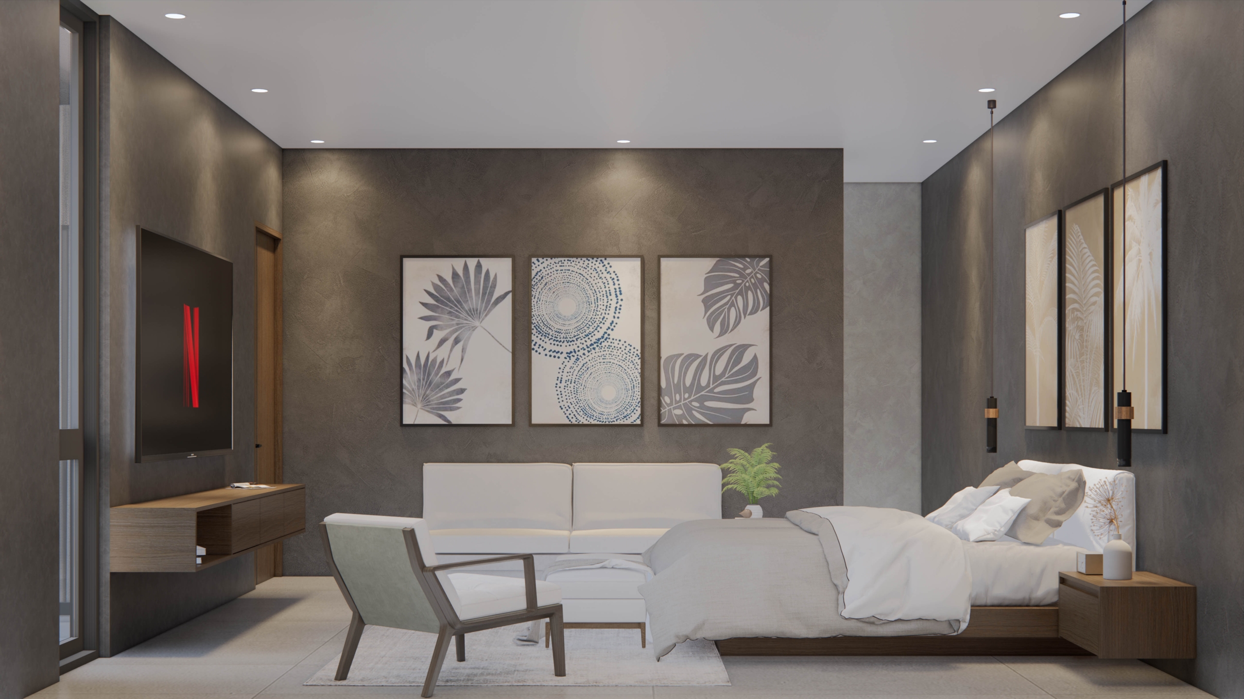 The upper level of this villa features 2 master bedrooms, each with an ensuite bathroom, and a walk-in closet. This floor is also completed with a cozy working area and a private balcony for viewing the beauty of the surroundings and enjoying the flow of evening breezes signature of this village. With a vast parking area suitable for a car or a few bikes, this property offers extra comfort in its modern and elegant design.