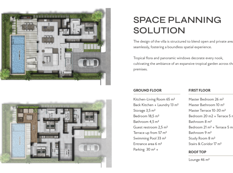 Set on 440-720 sqm of land, it unveils a generous 421 sqm of living area across a meticulous two-story layout. The interior showcases four spacious bedrooms, each with its own ensuite bathroom and walk-in closet, a generous living room, a fully equipped modern kitchen, and an inviting dining space. In addition, this amazing property also features a storage room, a laundry room, and a powder room for added convenience. The exterior of this villa showcases a private swimming pool spanning 33,5 sqm, a spacious pool deck that seamlessly connects to the foyer and lounge area, a beautifully landscaped garden, and an open private parking space that is suitable for several cars and motorbikes. Yet the villa’s true highlight lies in its stylish rooftop section on the top floor – a perfect haven to take in the panoramic views, unwind, and enjoy memorable moments of leisure and entertainment with loved ones.
