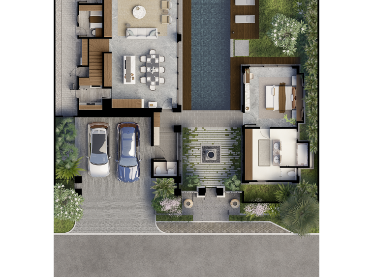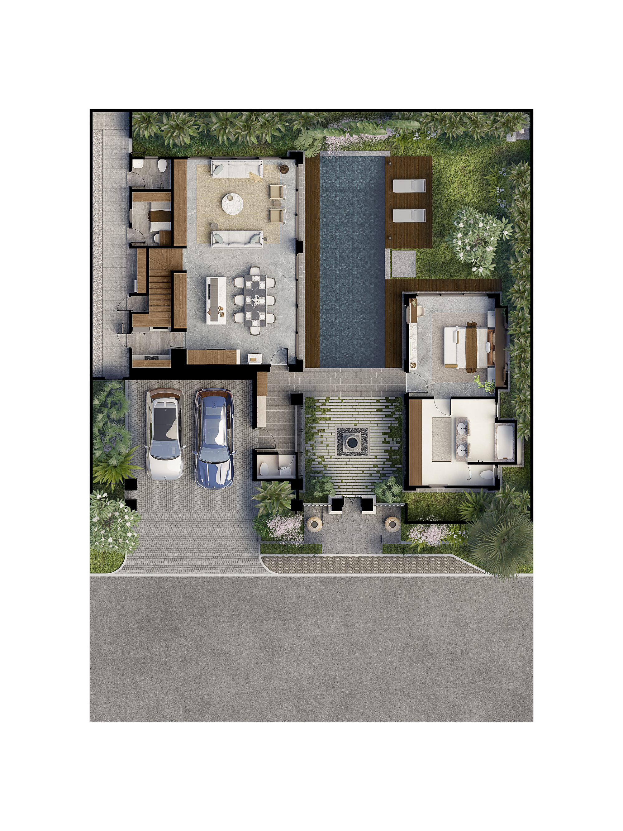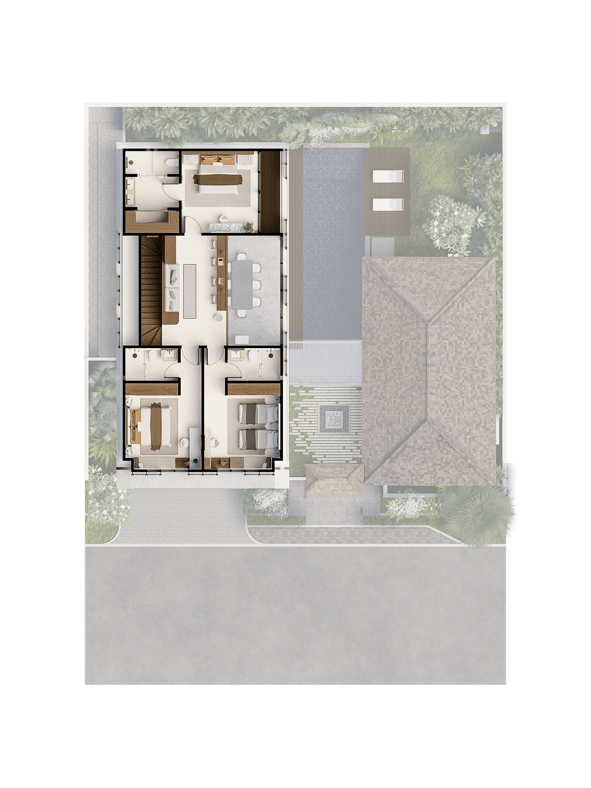The open area of this beautiful property offers a large private pool, a surrounding sundeck area, and beautiful tropical gardens that extend to the front area. In addition, with its thoughtful layout, this villa also provides a special parking space for residents which is enough for 2 cars and several motorbikes.