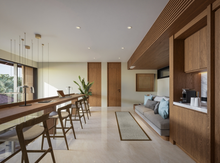 The main building has a wonderful 2-story layout. The first floor offers a spacious living area that combines a dining room, a TV room, and a kitchen. In addition, a maid’s room equipped with a bathroom is also located on this floor. Upstairs, there are 3 master bedrooms each equipped with a full bathroom and a walk-in closet, a family room, and a co-working space.