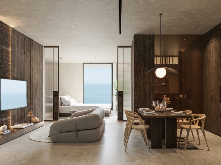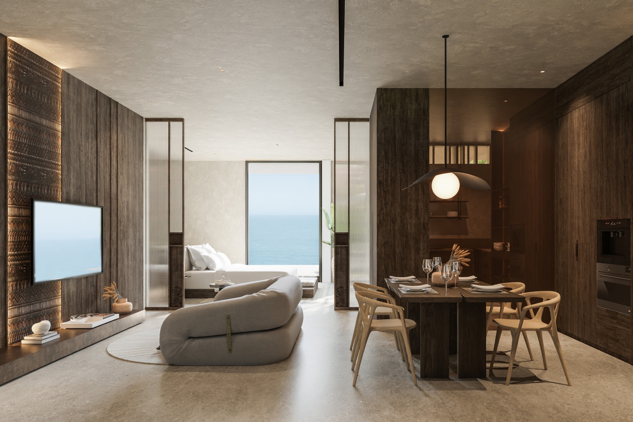 Its contemporary, elegant interiors feature one bedroom, a full bathroom, a functional kitchen, a cozy living area, and a private terrace overlooking the garden, swimming pool, or the ocean. Shared facilities include a rooftop section with an infinity pool, a bar & restaurant, a sauna & cold plunge, a lounge area, a spacious lobby, a Japanese tea garden, and an underground ample parking to accommodate all vehicles.