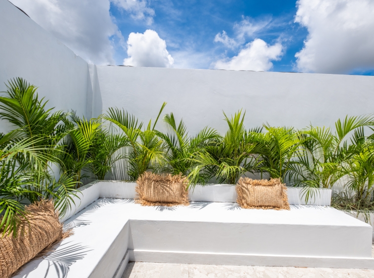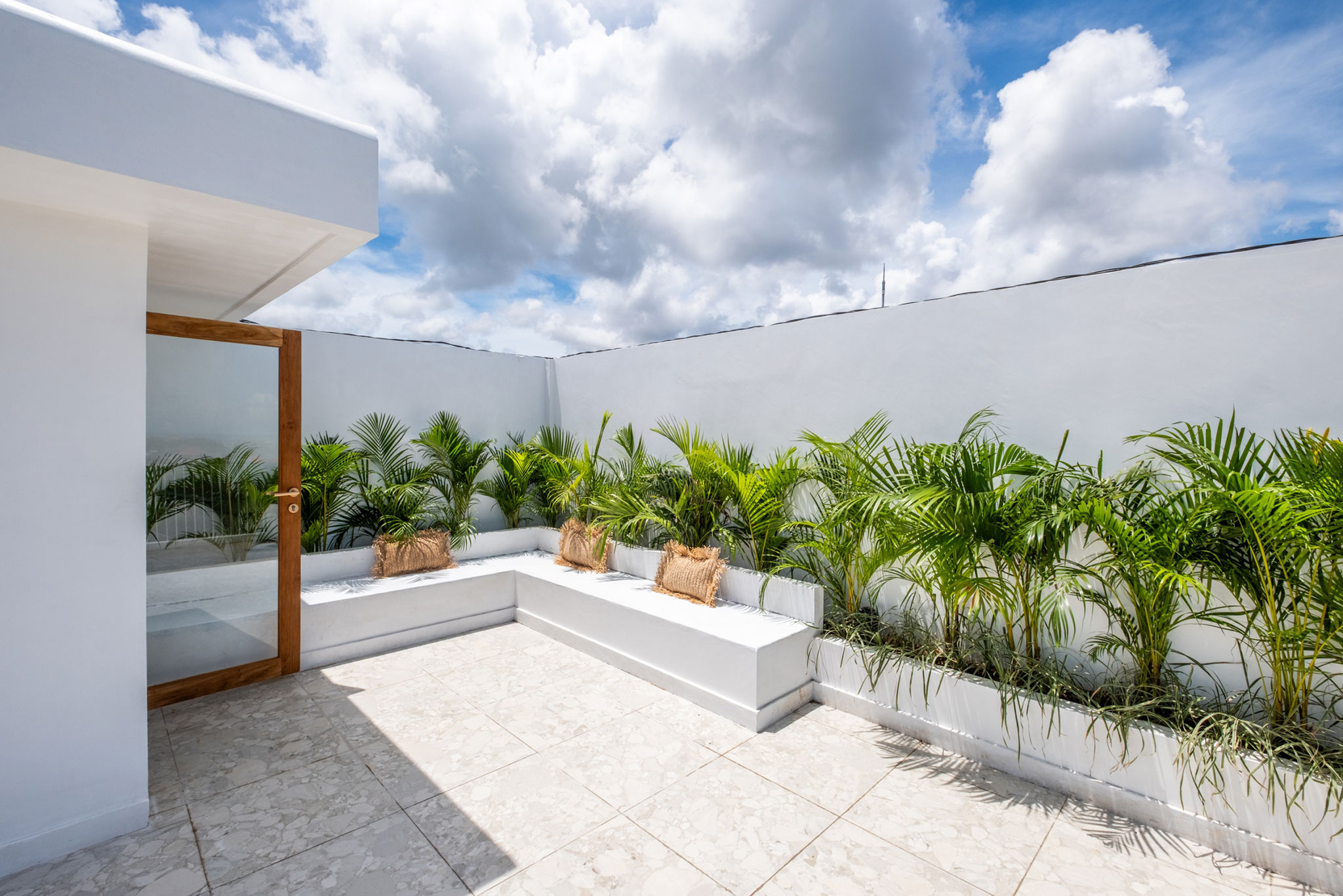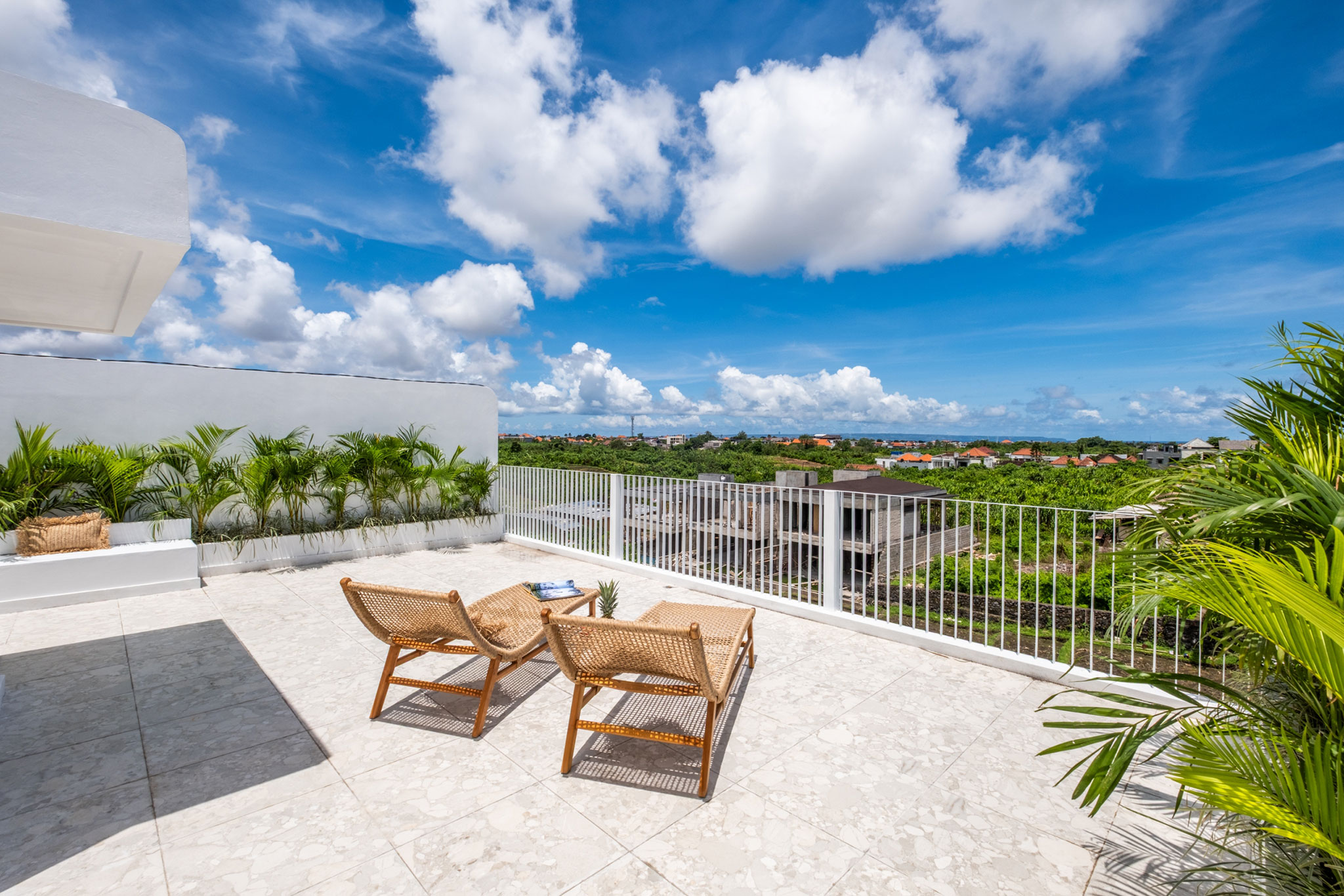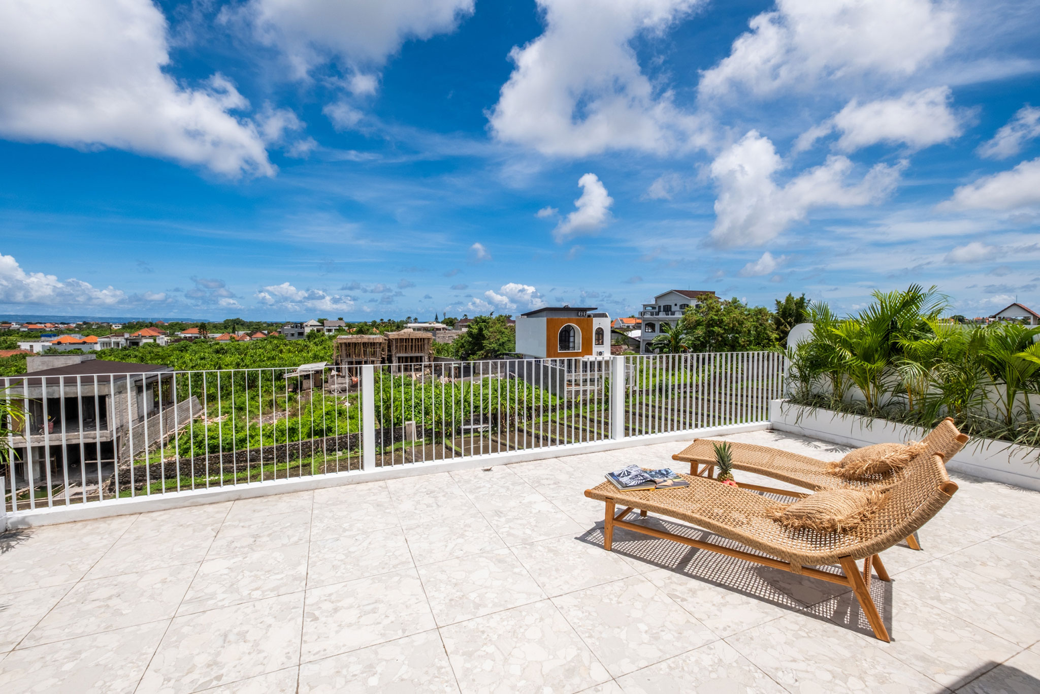The top floor features an expansive rooftop section with a semi-open seating area, a jacuzzi, a large open space with seating and loungers, and a verdant garden. The outdoor section of this villa features a private swimming pool, a large foyer, a tropical garden with stepping stones and sun loungers. Additionally, this stunning villa provides a private space for parking several motorbikes.