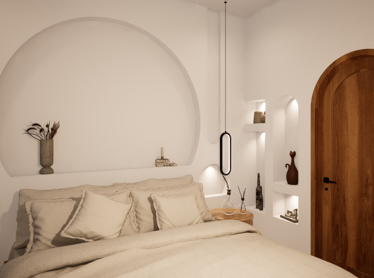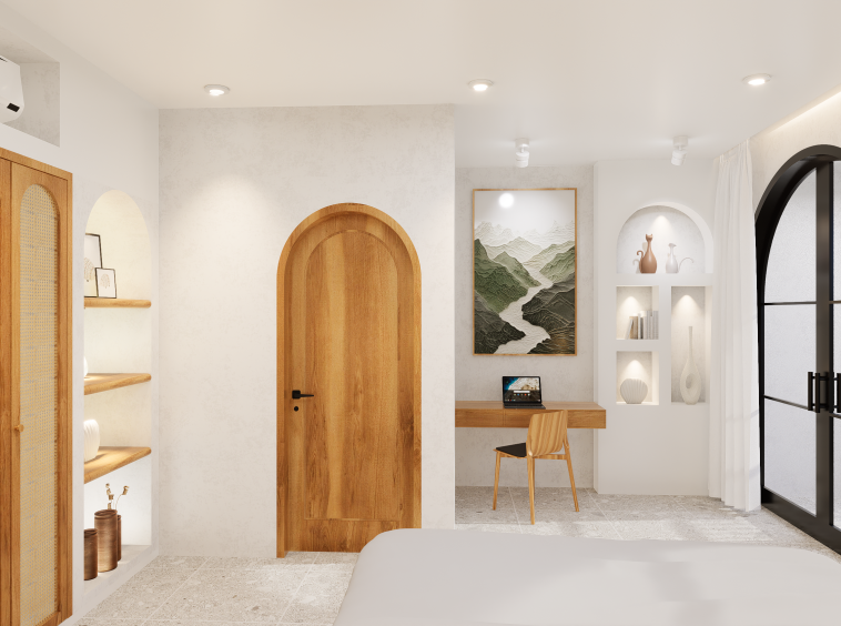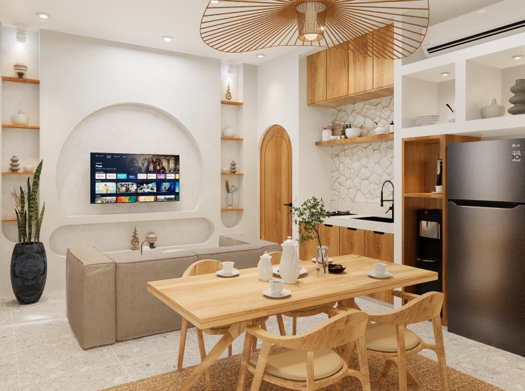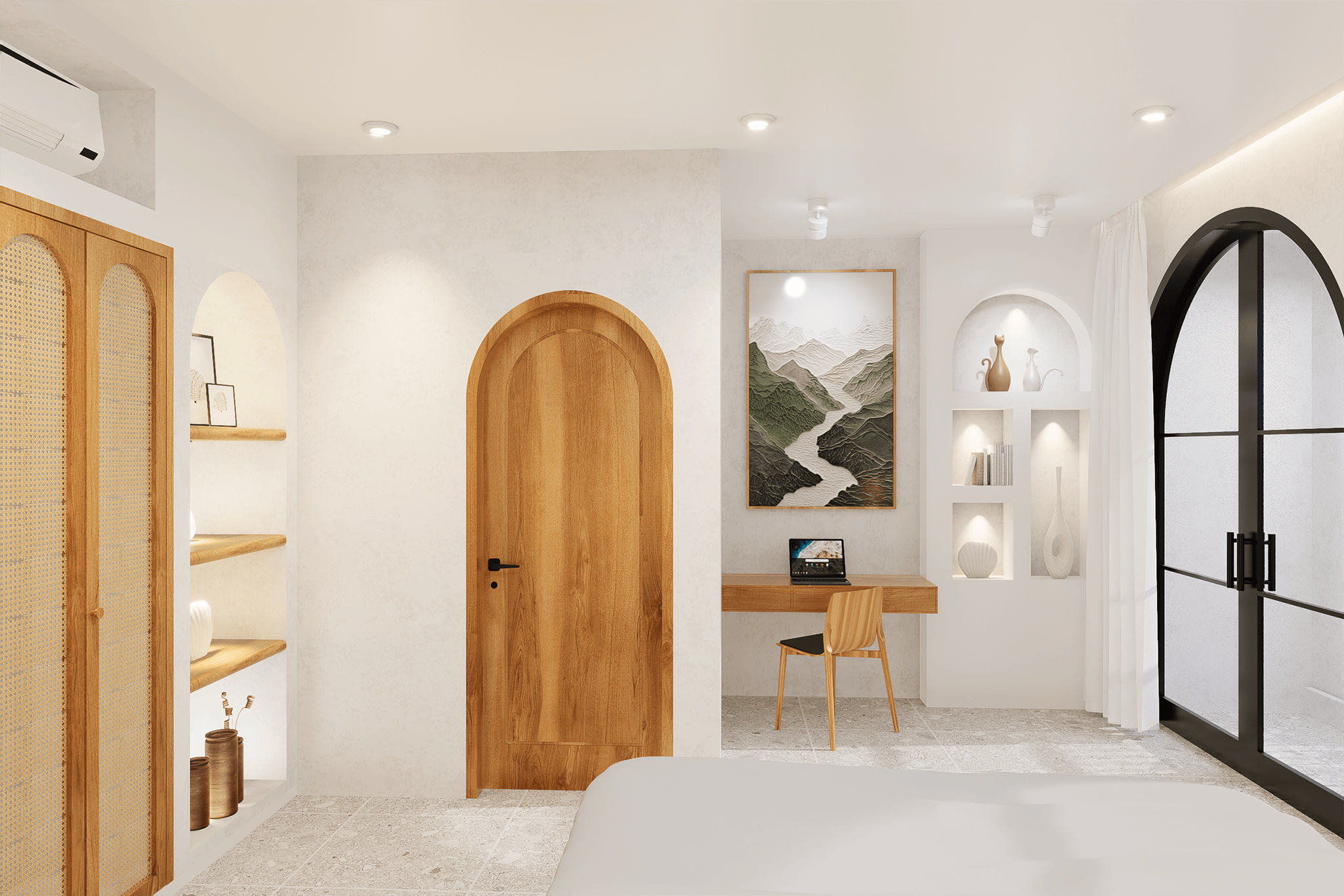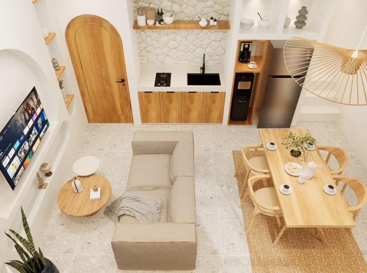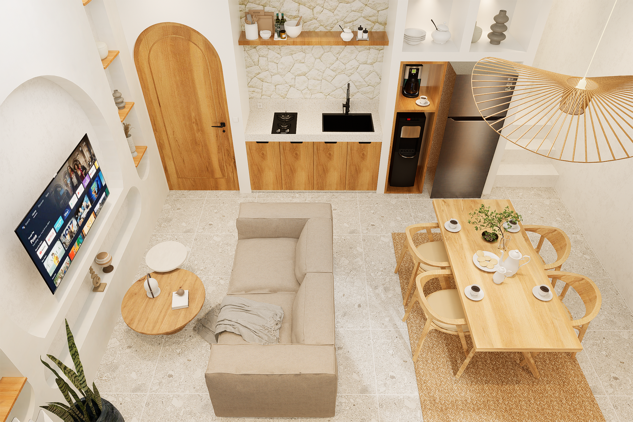 Spanning a generous 90 sqm of land with 75 sqm of living area across a meticulous 3-floor layout, this charming home boasts a modern and convenient living experience through its clean and elegant Mediterranean-inspired design. The ground floor features a spacious living area with sunken seating, a cozy dining space, a modern-equipped kitchen, storage, and a guest toilet. The upper floor features 1 large bedroom, an ensuite bathroom, and a balcony. Both floors are installed with large glass windows, creating a connection nuance with the outdoor section.