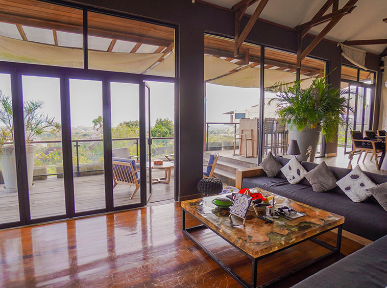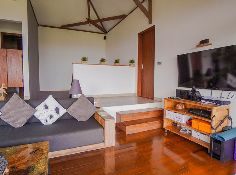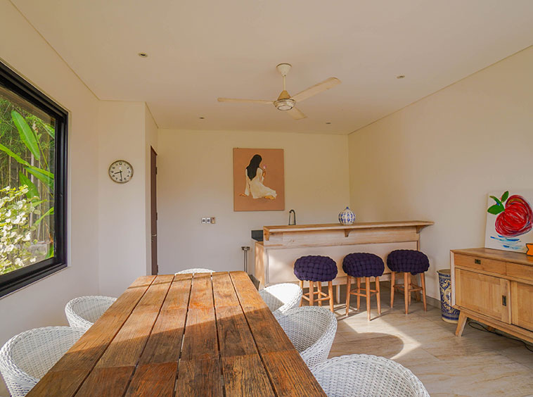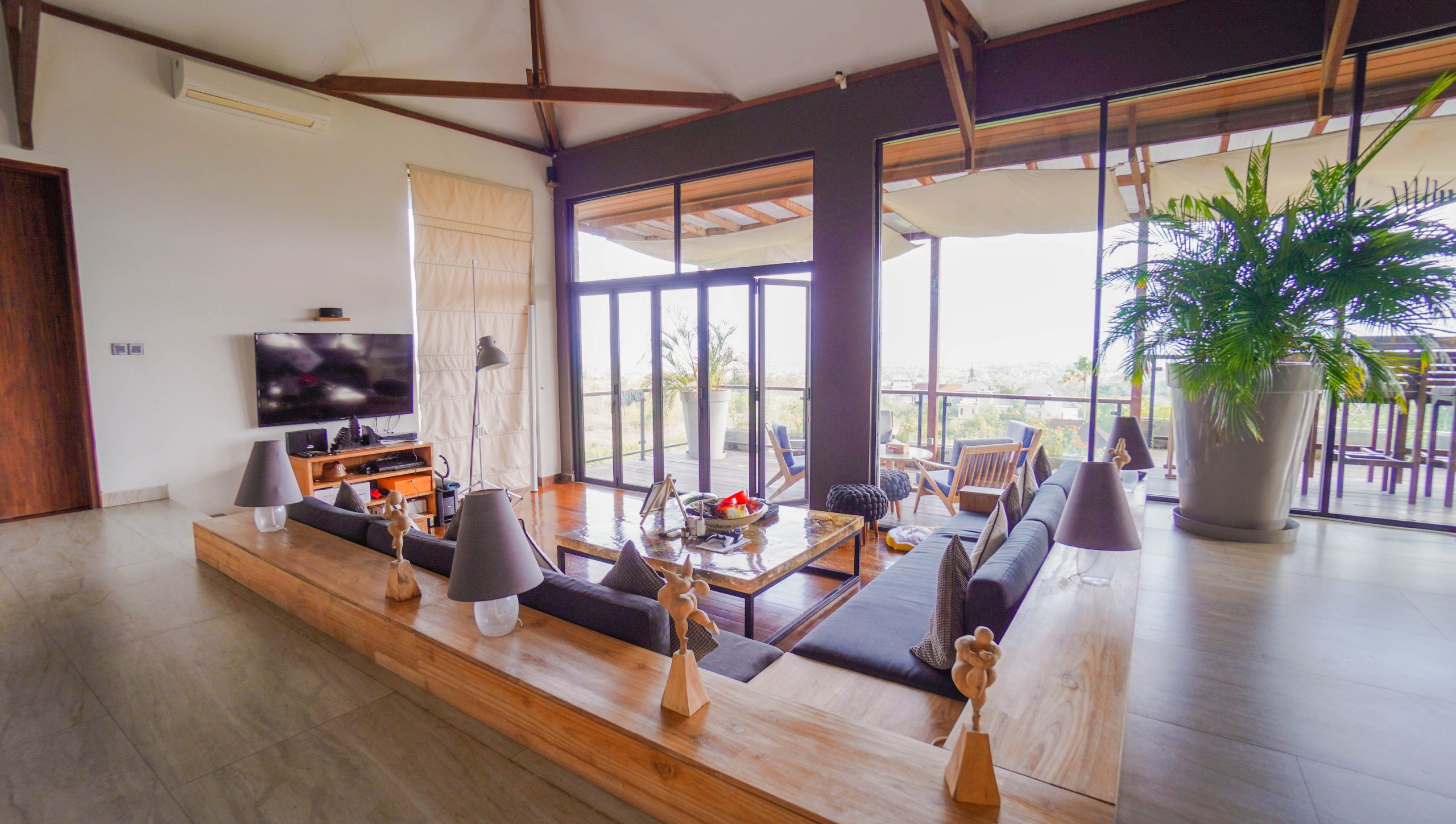 The living room is elegantly enclosed, providing a private space for intimate gatherings or tranquil moments. Additionally, a balcony overlooks the stunning view of Jimbaran Bay, allowing you to enjoy the gentle breeze and the beauty of your surroundings.