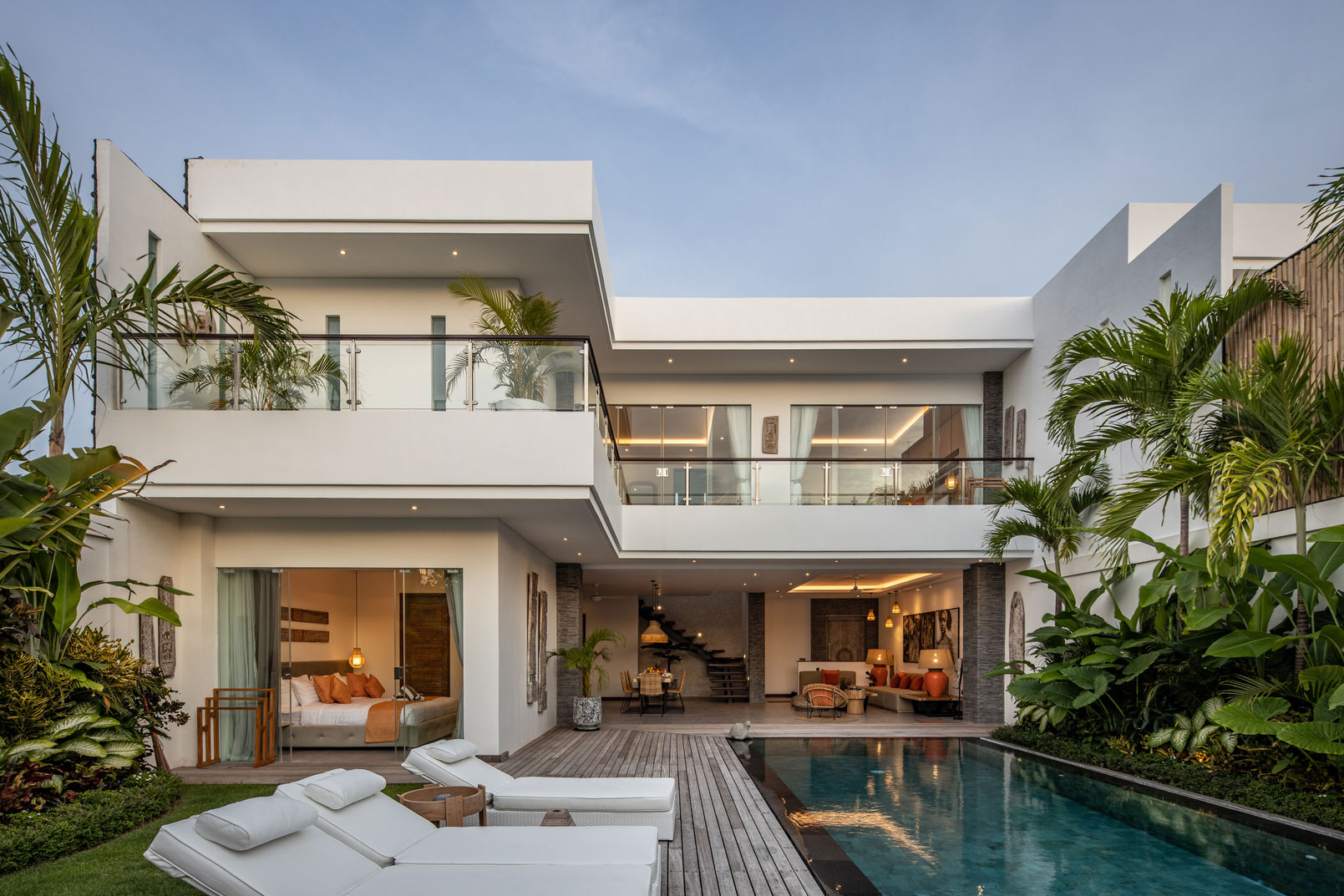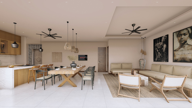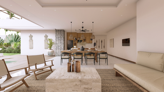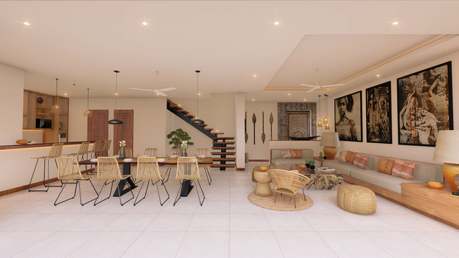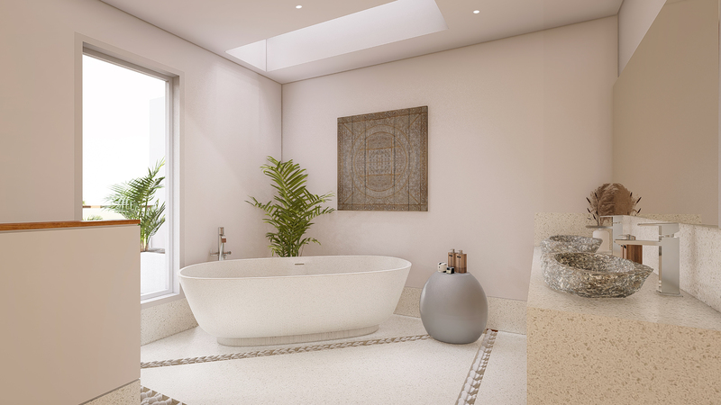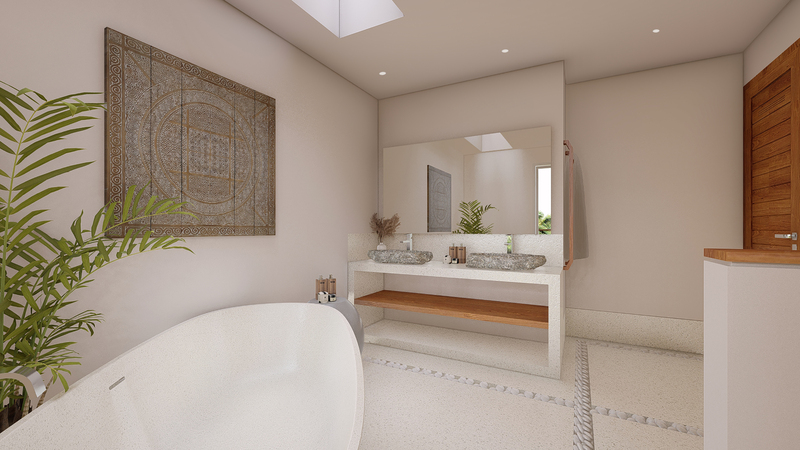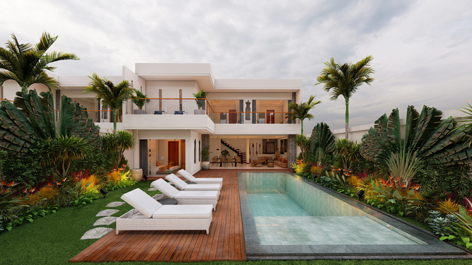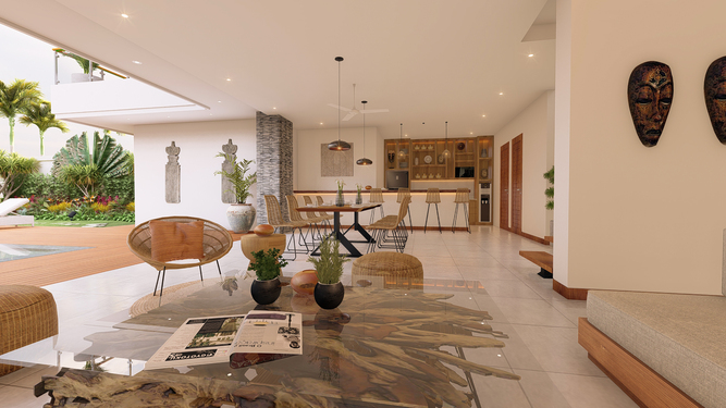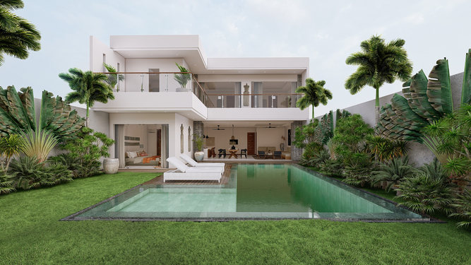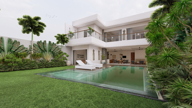 Located in Berawa this 4 bedroom off-plan villa is designed to optimize the space to the best, creating an L shape 4 bedroom villa with a generous living space area overlooking the garden and pool area, The main area offers a fancy dining space and a beautiful Lounge corner all in one large breezy plateau, those volumes will deliver a nice modern style to the villa and luxury feel, The spacious main open space is elegantly designed in a mix of soft sophistication and tropical touch. Fully equipped the villa is ready to plan fancy dinners in a cool breeze coming from the garden and pool area. The bar and kitchen space are designed for optimum functionality and the decoration gives a cozy feeling with the wooden library filled with antiques and Balinese statues.