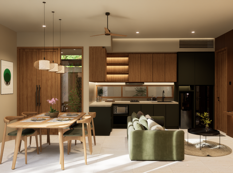 Set on a 204 sqm plot, this beautiful villa boasts a 91 sqm living space, beautifully arranged over a single level with two optional finishes: Balanced and Luxury. The interior unveils two spacious bedrooms, each with a full bathroom, a generous and modern living room, a fully equipped kitchen, an ample dining area, a home office, and a common toilet. The exterior highlights a large private swimming pool, an ample pool deck, and an expansive tropical garden. As part of a secure compound, this property offers access to a spacious shared parking area that accommodates all types of vehicles.