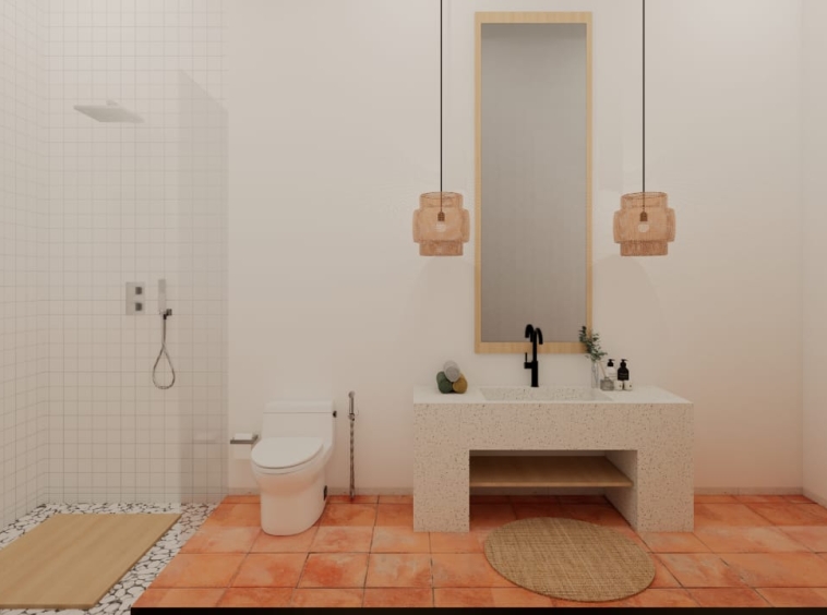 On the outside, there is a lovely private swimming pool, an expansive terrace with sunbeds, a backyard with a lush tropical garden, and a fancy entrance with a footpath and garden. In addition, this villa also provides private parking suitable for a car and several motorbikes.