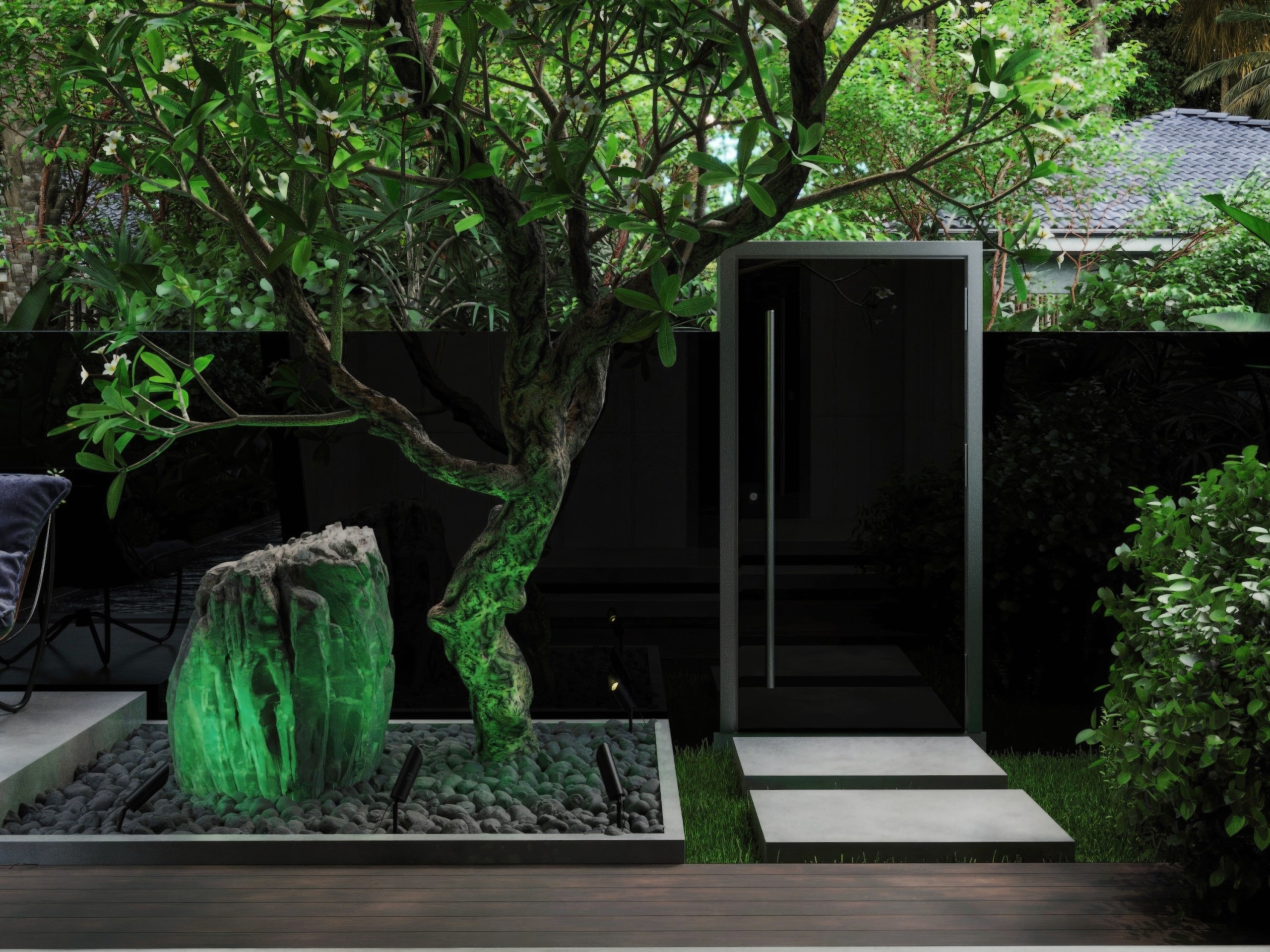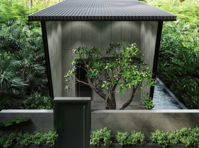 The exterior of this property features a private swimming pool, a beautiful tropical garden, a pool deck, and a foyer with seating. As part of a modern villa compound, this house will share common facilities such as a parking area, co-working space, a public swimming pool, and a cafe. The construction of this villa is in progress with the completion expected in September 2025.