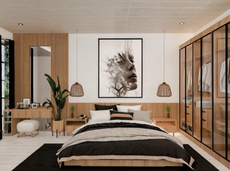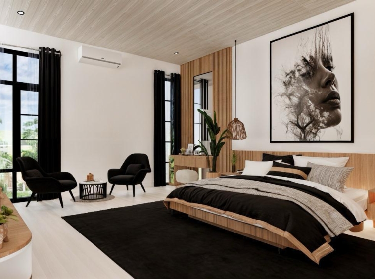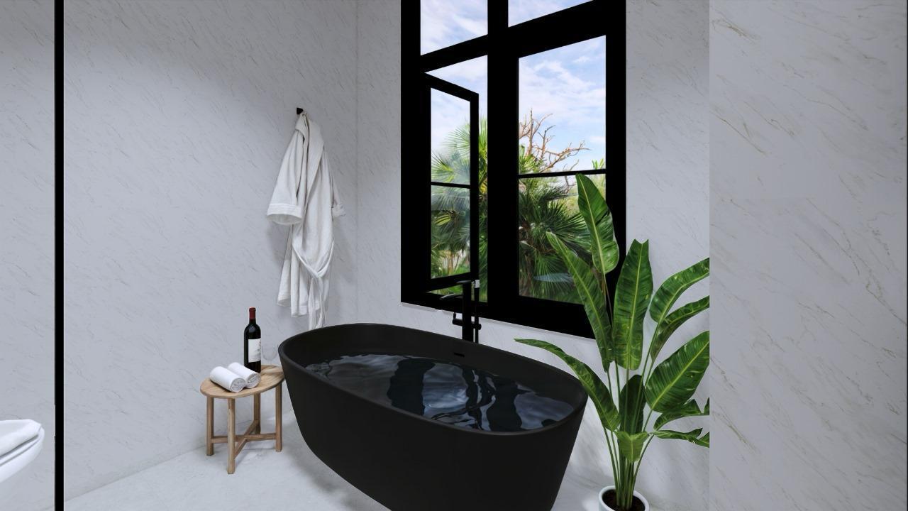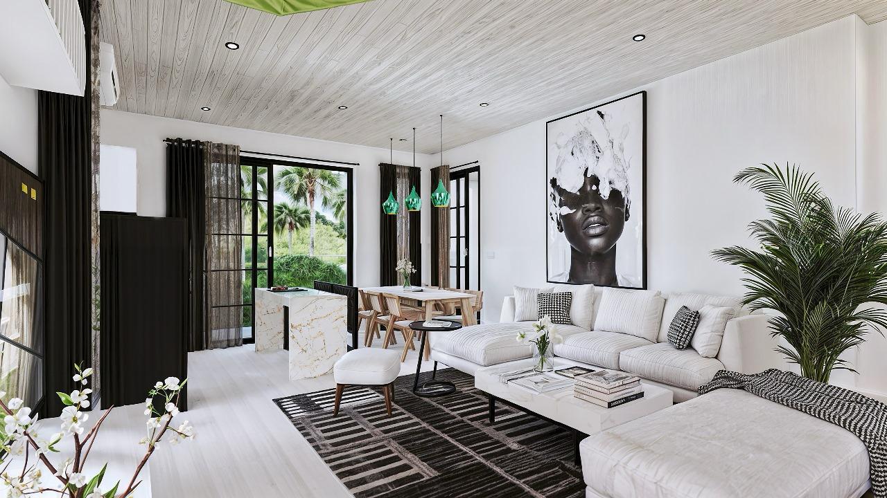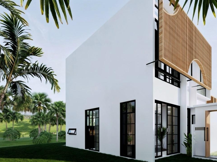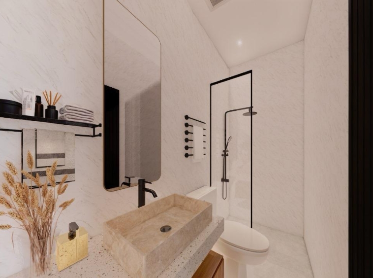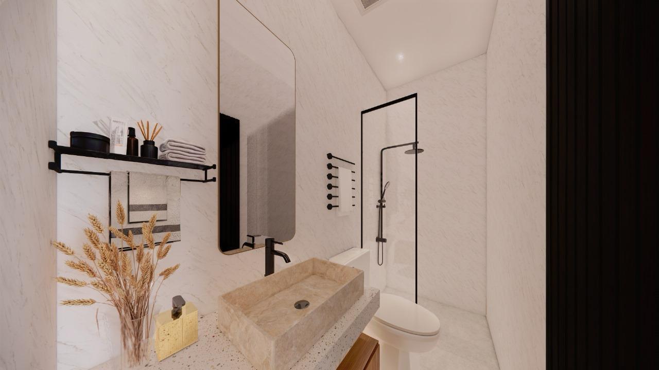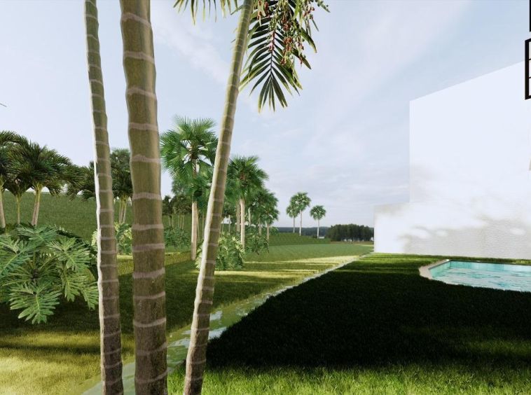 This villa is laid on 233 sqm of land, offering 123 sqm of living area on a thoughtful 2-story layout. The ground floor interior features a spacious bedroom with an ensuite bathroom, an ample living room, a modern-equipped kitchen, a cozy dining space, and a dedicated storage room. The second floor features 2 expansive bedrooms, each with an ensuite bathroom, a walk-in closet, and a balcony. All rooms are fitted with large glass windows, allowing natural light to illuminate all interior sections, especially on the 2nd floor, allowing residents to enjoy the view of the wonderful rice fields surrounding the villa.
