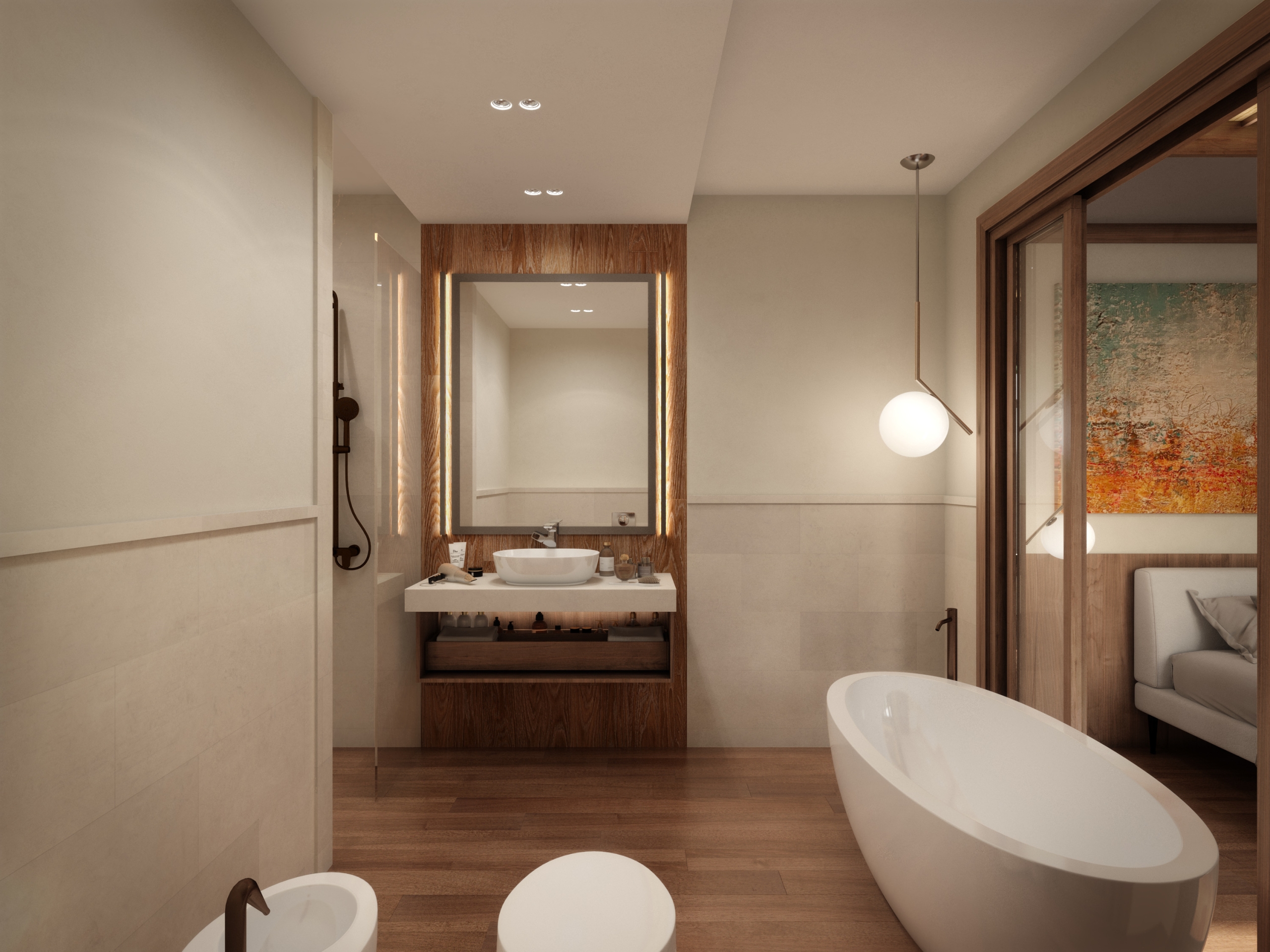The upper floor boasts 2 spacious bedrooms each with its ensuite bathroom. On the top floor, there is a spacious room of free purpose, which you can turn into a gym, office, living room, or bedroom according to your preference. There is a bathroom, of course, as well as a convenient storage room.
