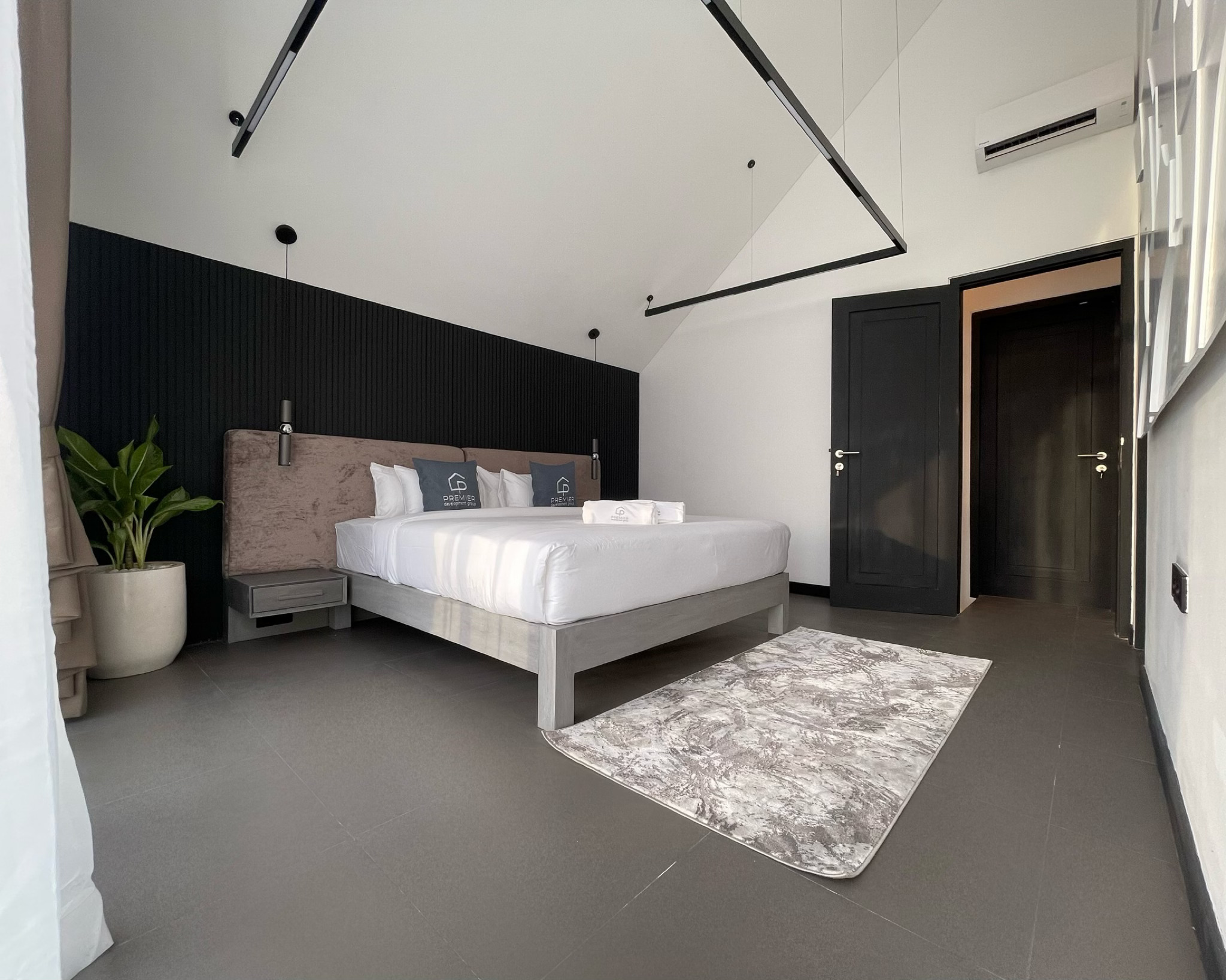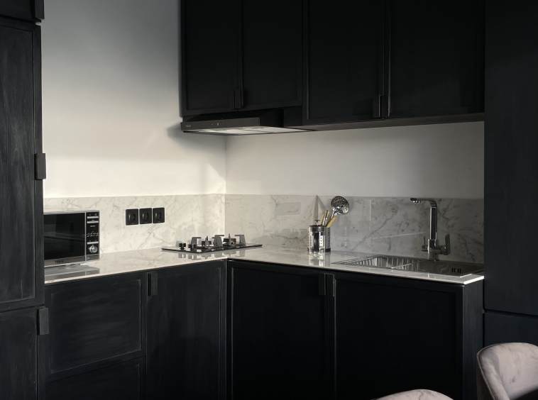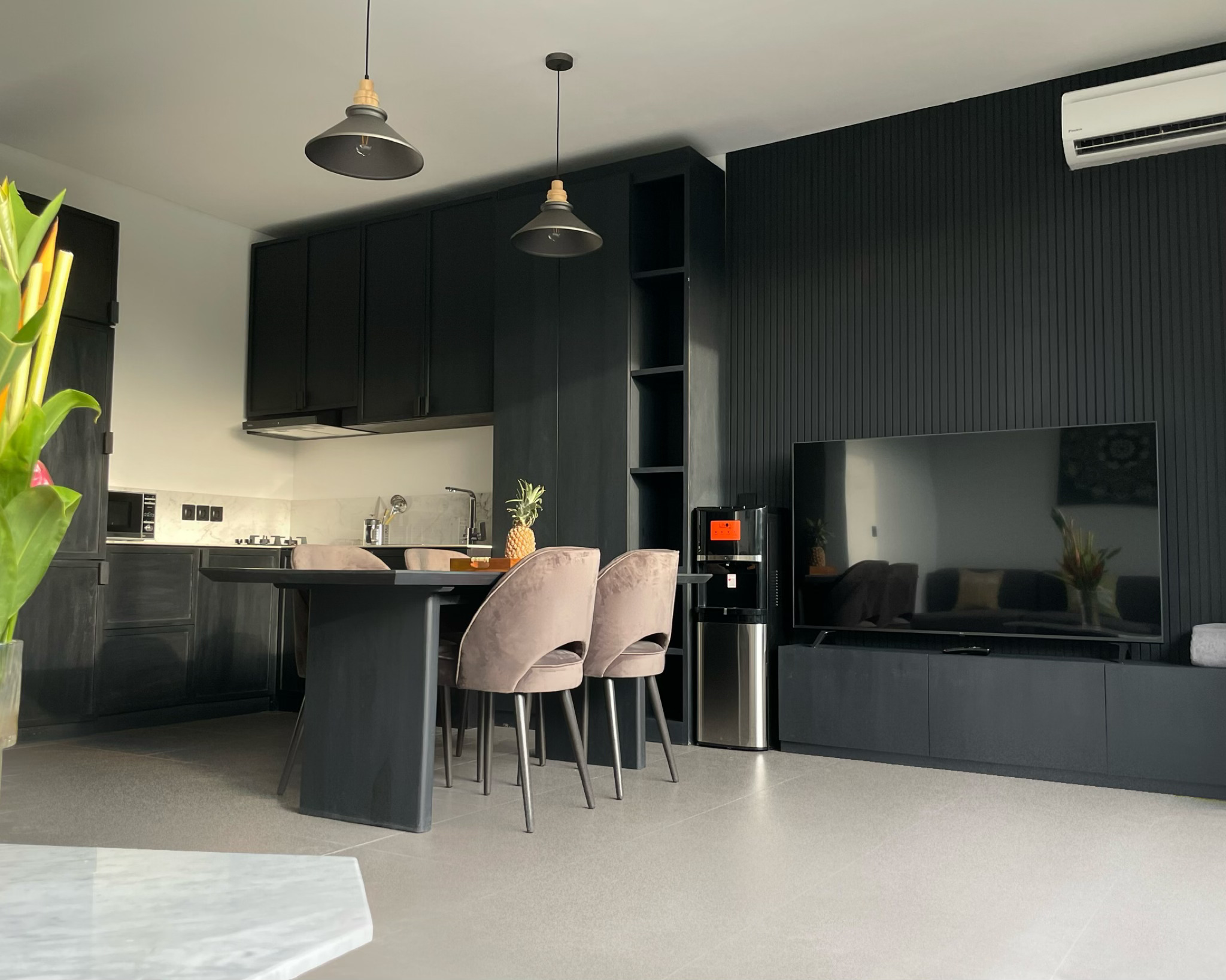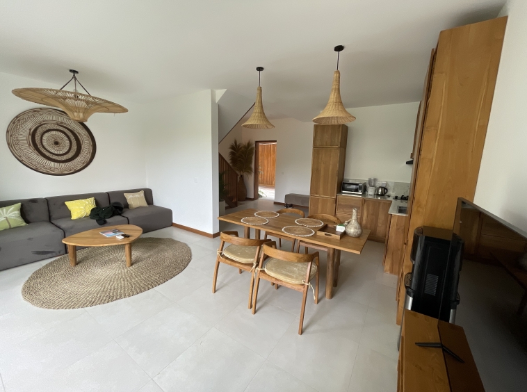 As you enter, you’ll be greeted by a spacious living room, elegantly appointed with modern furnishings that are available in 2 colors: natural and black; and ample natural light streaming in through large windows. The adjoining kitchen is a chef’s delight, equipped with high-end appliances and sleek countertops, making meal preparation a breeze.