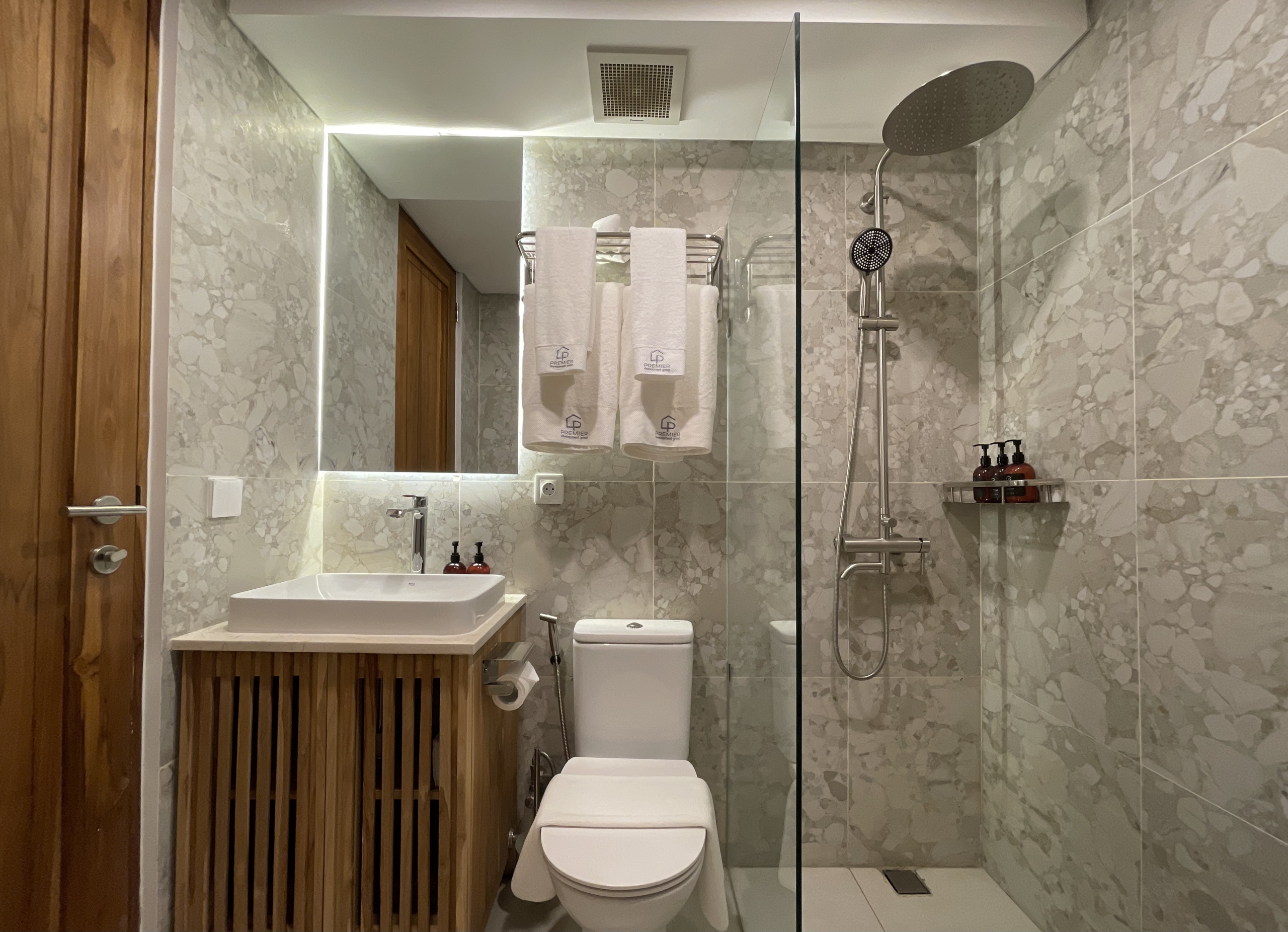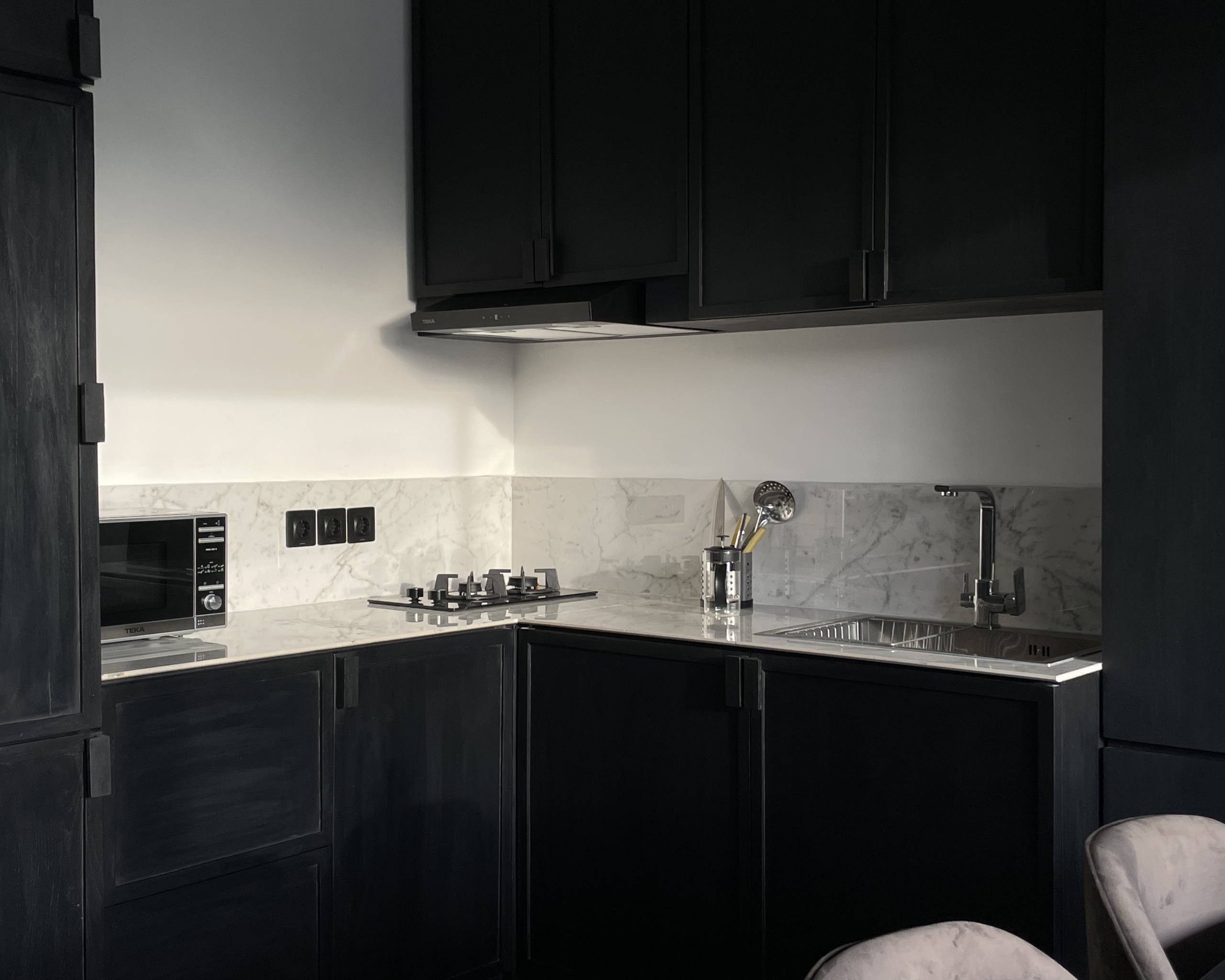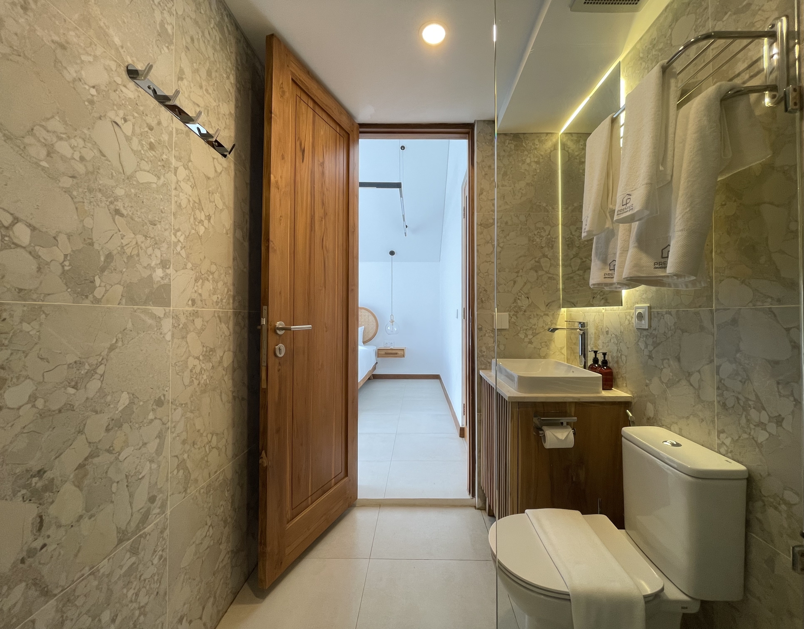 As you enter, you’ll be greeted by a spacious living room, elegantly appointed with modern furnishings that are available in 2 colors: natural and black; and ample natural light streaming in through large windows. The adjoining kitchen is a chef’s delight, equipped with high-end appliances and sleek countertops, making meal preparation a breeze.