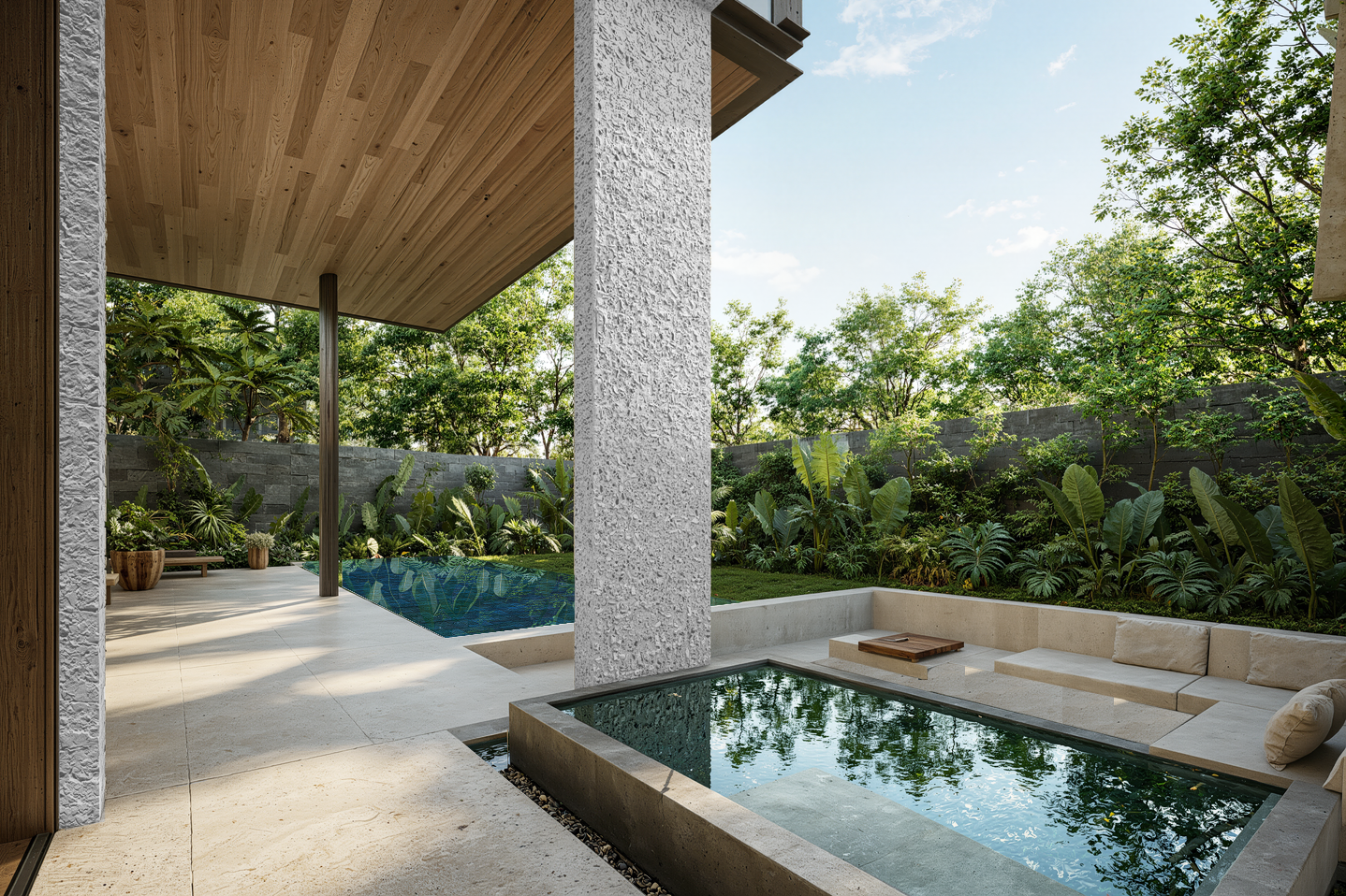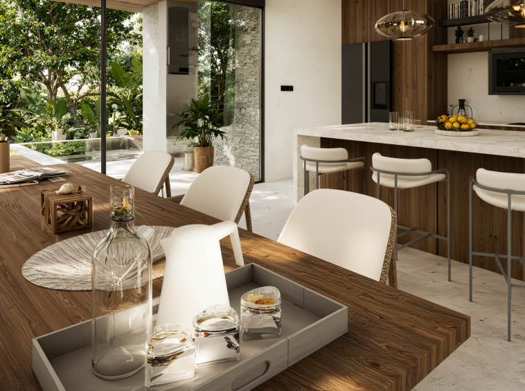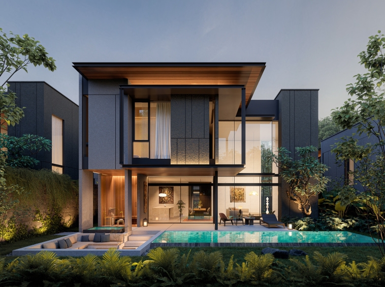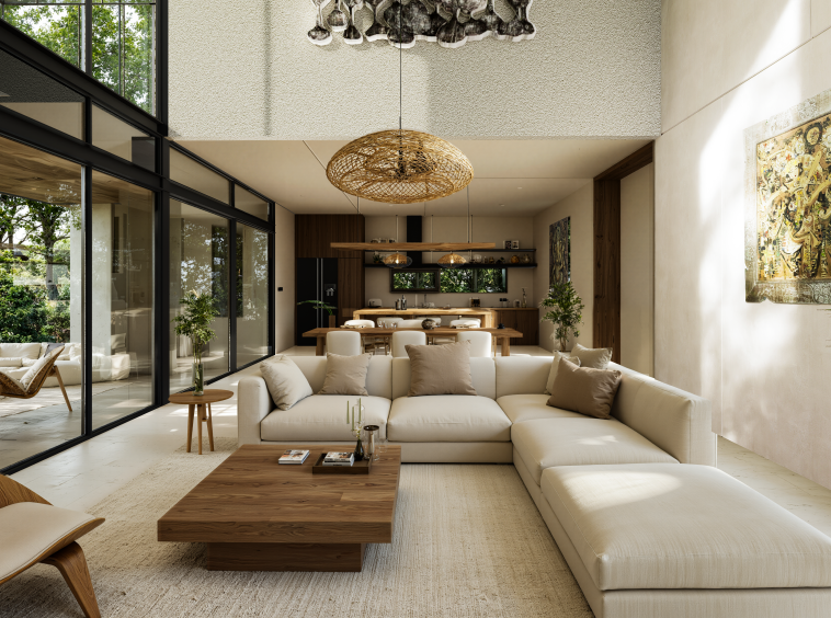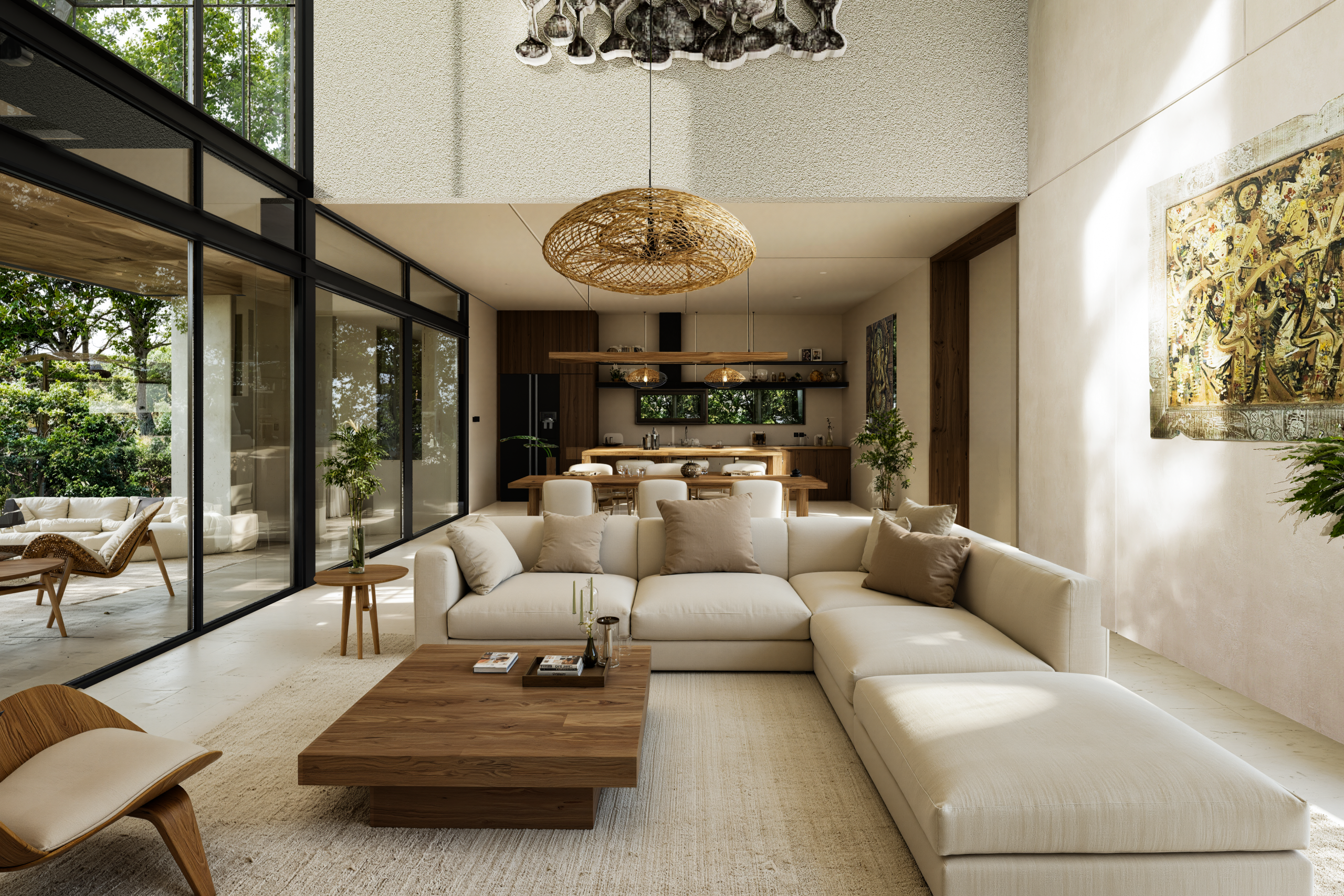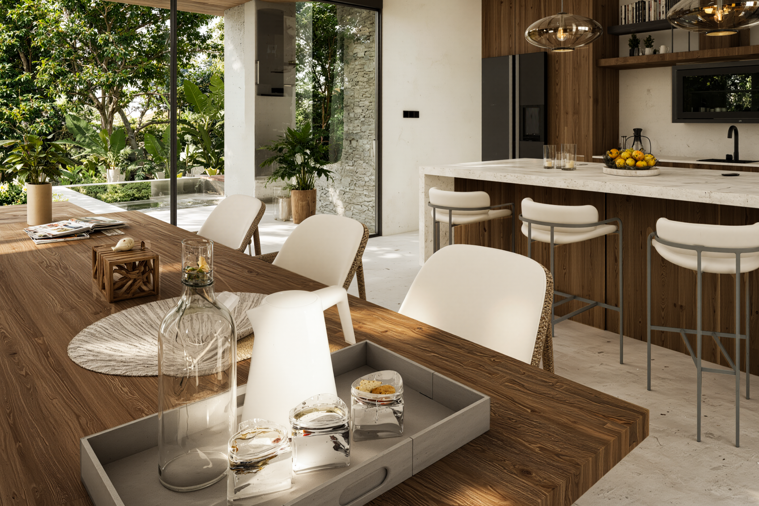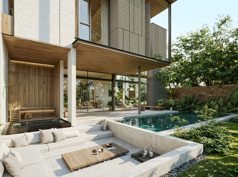 The villa offers a truly modern Bali living experience, thoughtfully reflected in every detail of its two-level layout design. Inside, it unveils four exquisite bedrooms, each with its own full bathroom and a walk-in closet, a spacious contemporary-style living room, a generous kitchen with an island adjoining a charming dining area, a dedicated storage room, and a powder room. Every section is bathed in natural light, thanks to the expansive floor-to-ceiling glass windows that beautifully blur the line between indoors and outdoors.