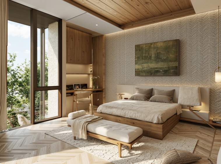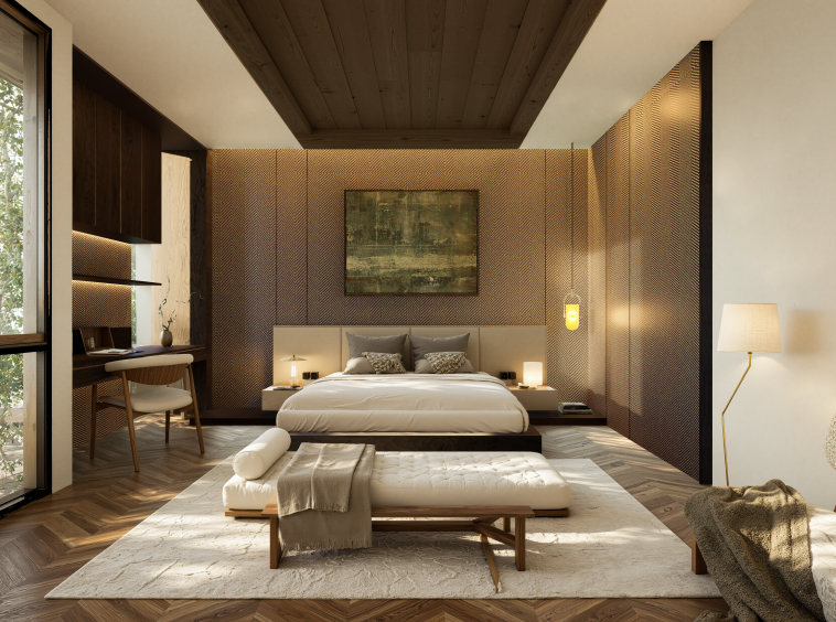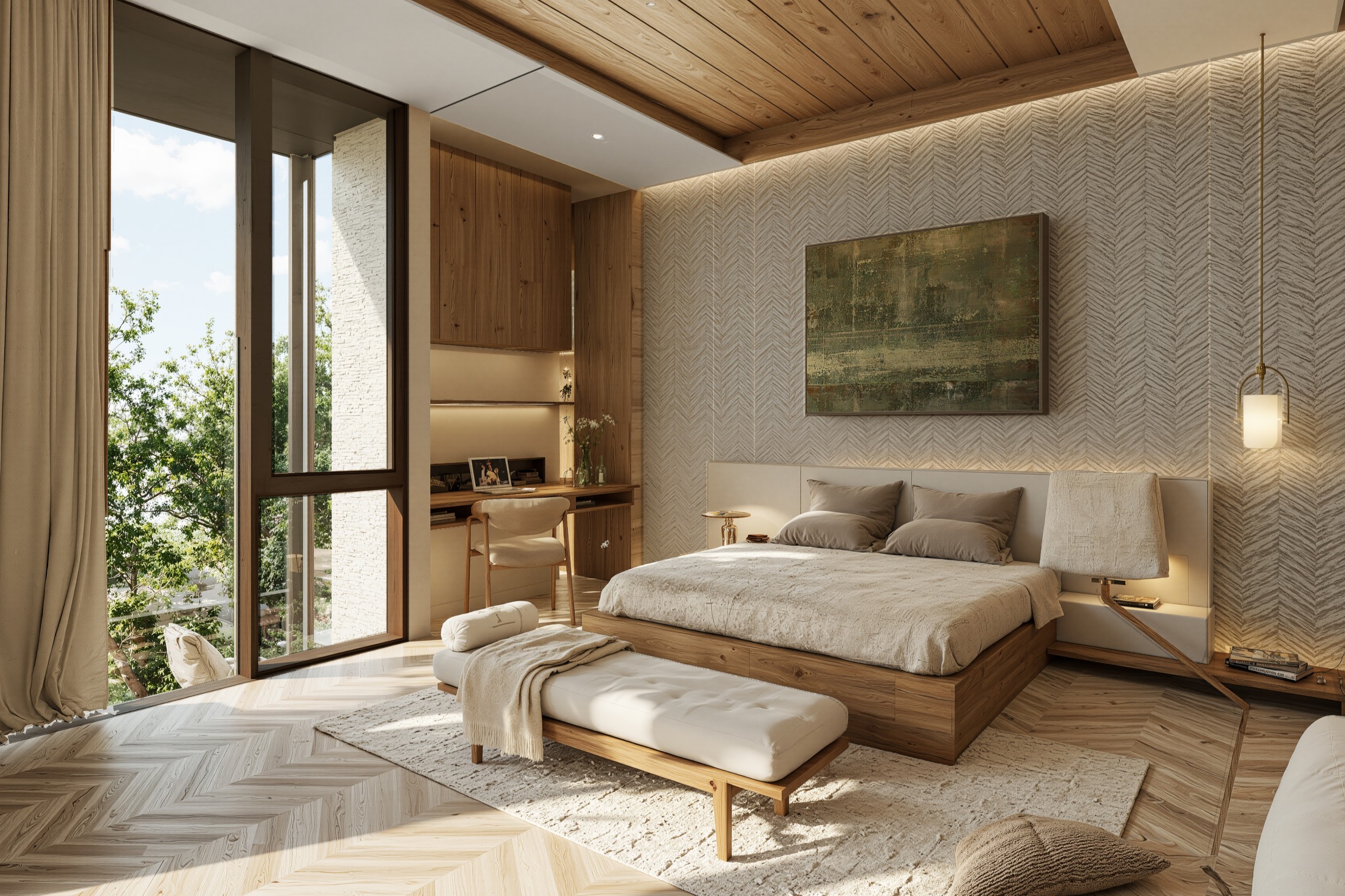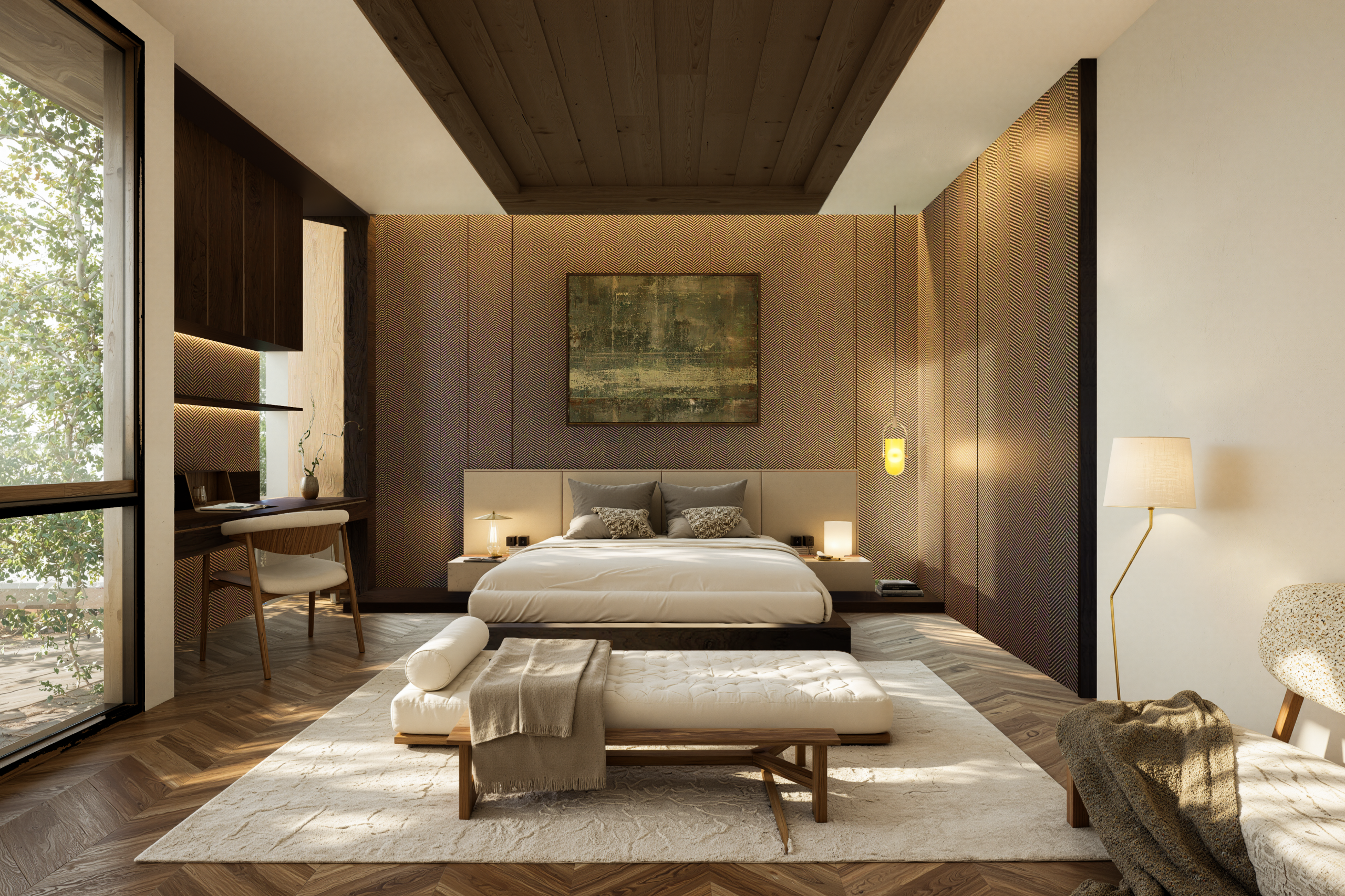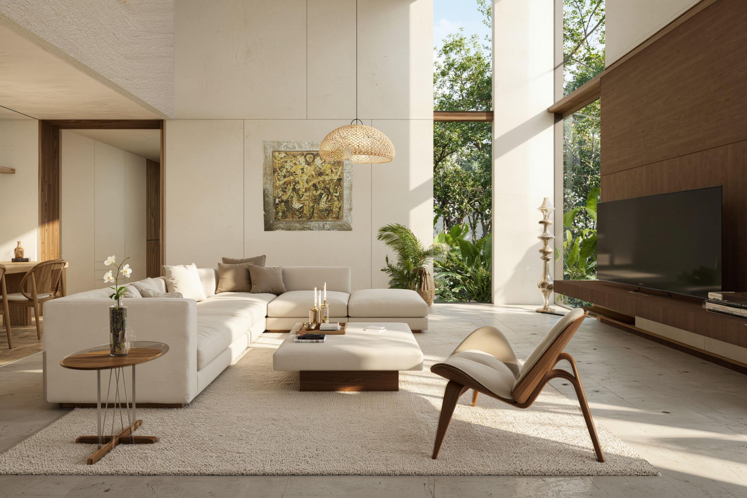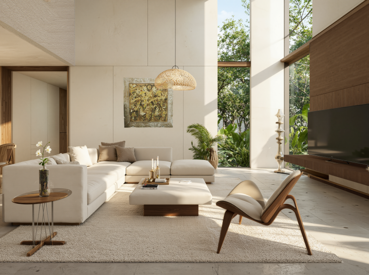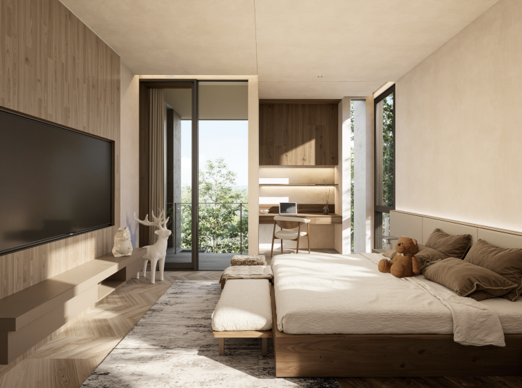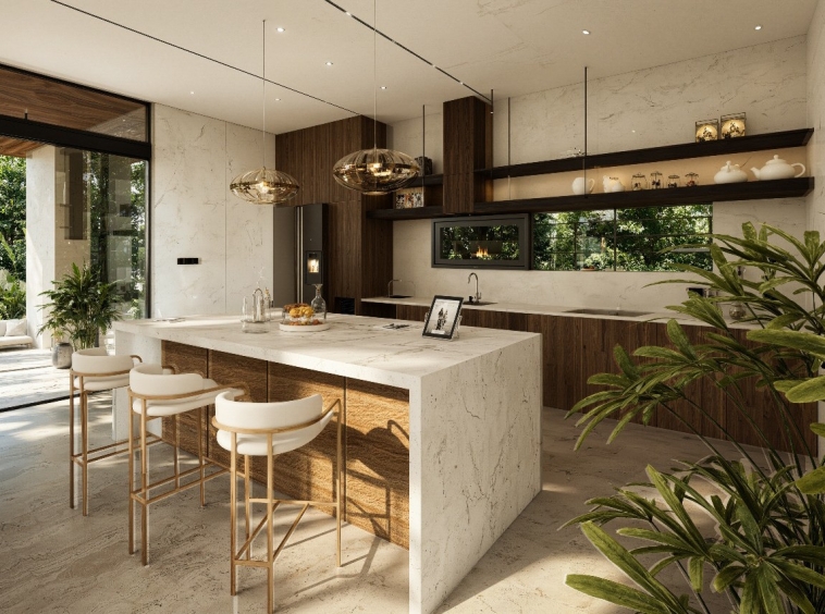 The villa offers a truly modern Bali living experience, thoughtfully reflected in every detail of its two-level layout design. Inside, it unveils four exquisite bedrooms, each with its own full bathroom and a walk-in closet, a spacious contemporary-style living room, a generous kitchen with an island adjoining a charming dining area, a dedicated storage room, and a powder room. Every section is bathed in natural light, thanks to the expansive floor-to-ceiling glass windows that beautifully blur the line between indoors and outdoors.