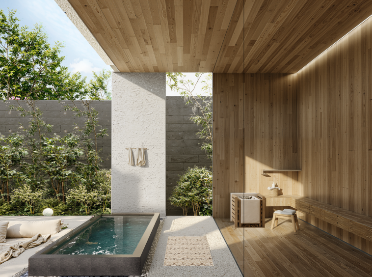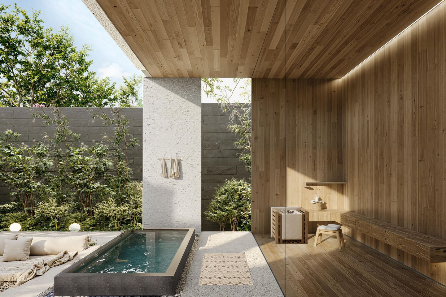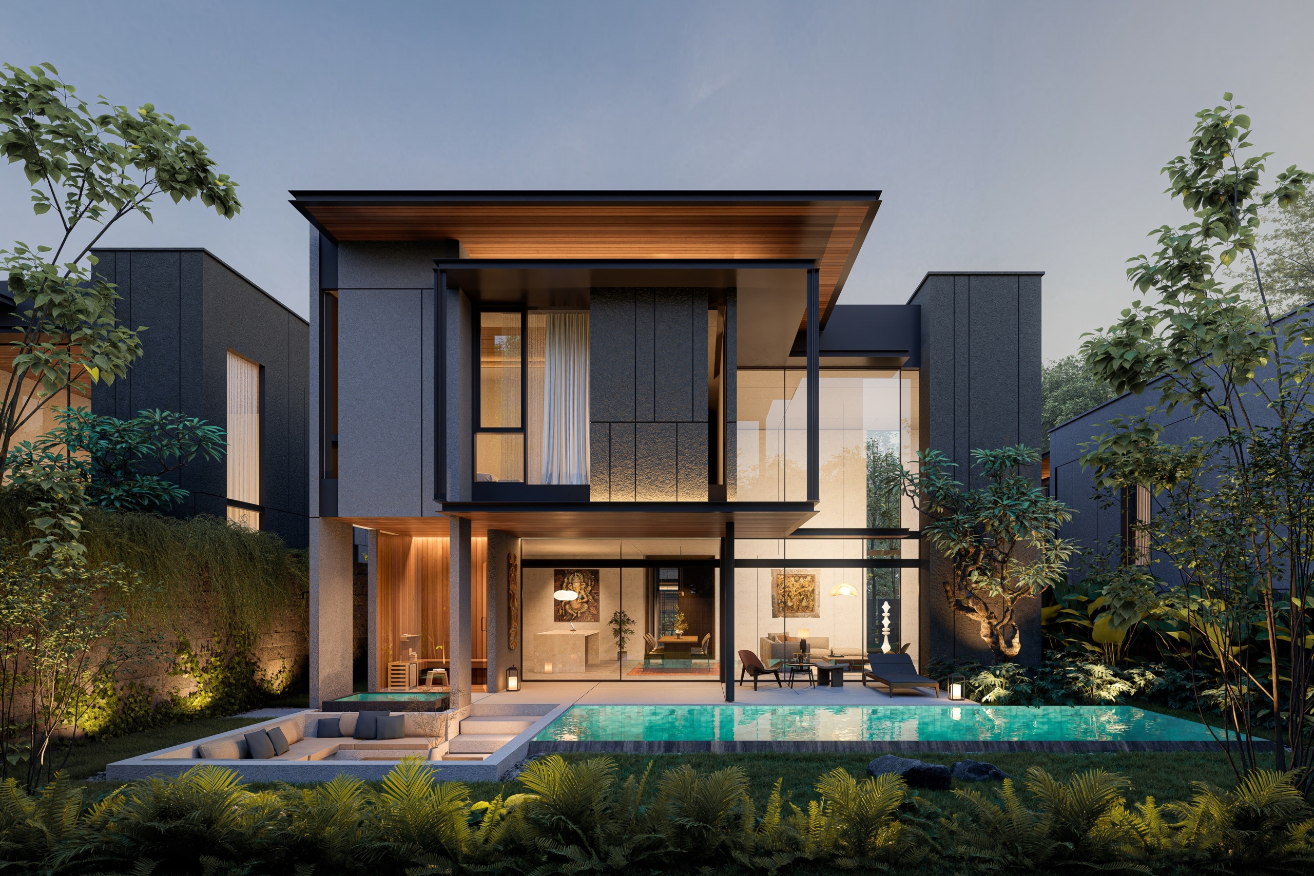 On the outside, it is a true sanctuary of relaxation featuring a dedicated sauna room, a refreshing cold plunge, a large swimming pool, an inviting sunken lounge, a barbecue section, and a lush tropical garden that completes the serene atmosphere. Additionally, this charming villa offers a private parking space suitable for two cars and several motorbikes. All of these are gracefully arranged on a 400 sqm plot with a total of 318 sqm of refined living space. As part of a compound, it enjoys 24/7 security service.